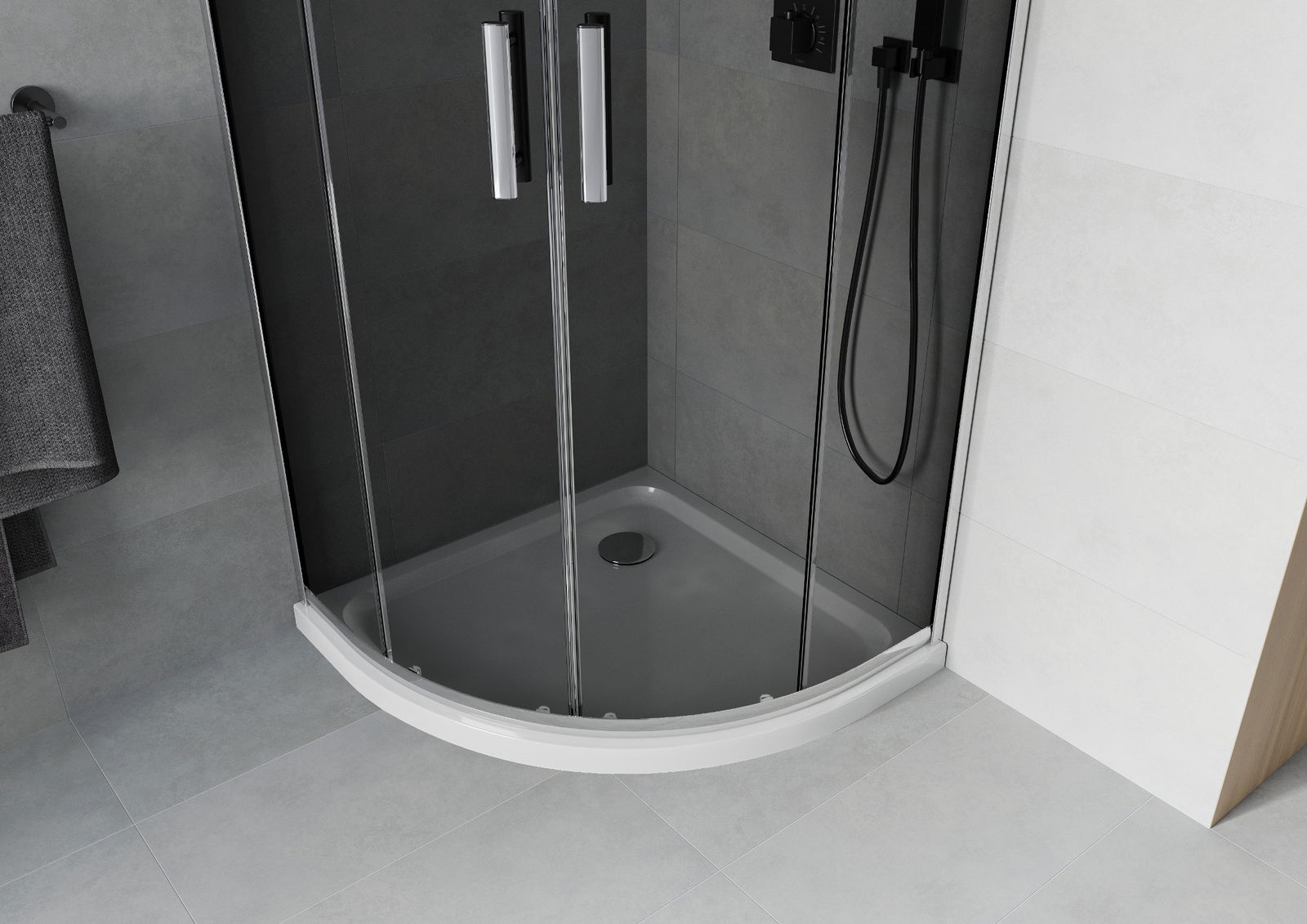 Det praktiska och bekväma handtaget är tillverkat av hållbar och tålig metall. Den moderna formen i kombination med en finish som matchar profilernas färg ger helheten ett modernt och stilfullt utseende, samtidigt som det framhäver estetiken i varje badrum.