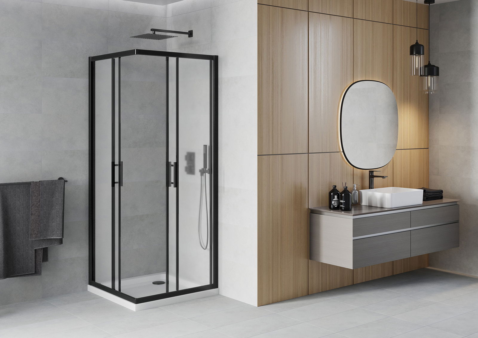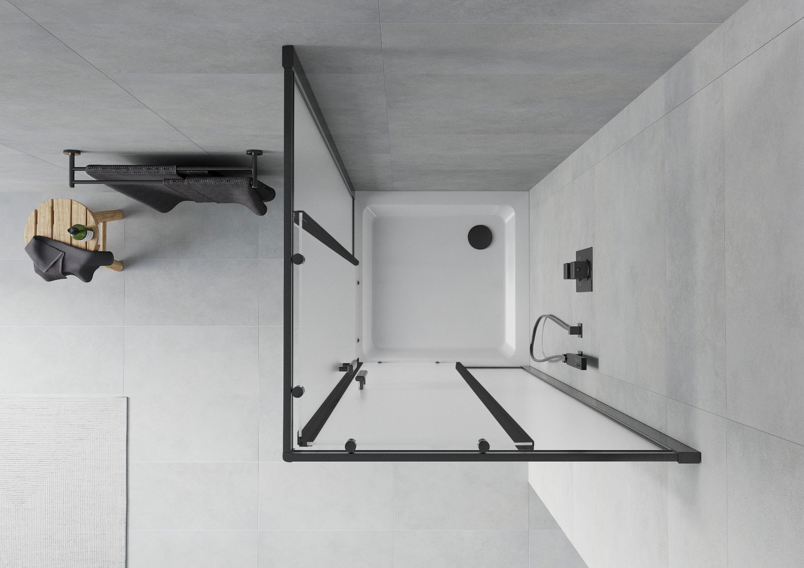 Det praktiska och bekväma handtaget är tillverkat av hållbar och tålig metall. Den moderna formen i kombination med en finish som matchar profilernas färg ger helheten ett modernt och stilfullt utseende, samtidigt som det framhäver estetiken i varje badrum.
