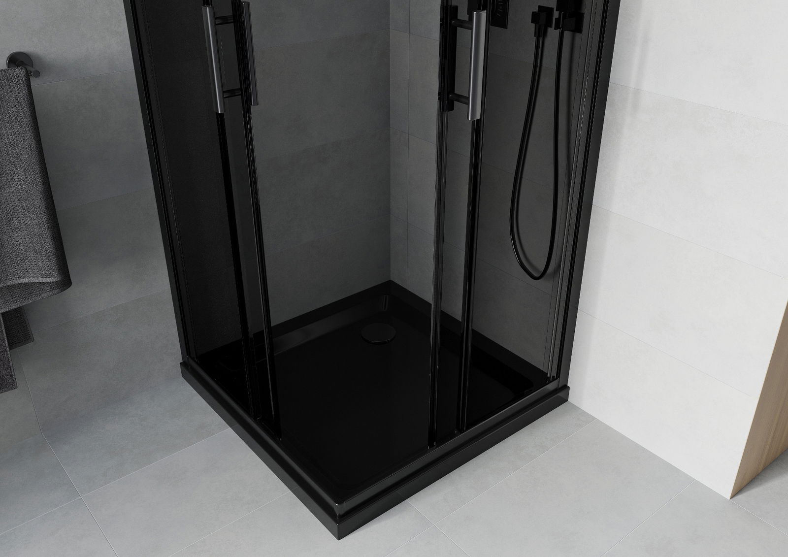 Det praktiska och bekväma handtaget är tillverkat av hållbar och tålig metall. Den moderna formen i kombination med en finish som matchar profilernas färg ger helheten ett modernt och stilfullt utseende, samtidigt som det framhäver estetiken i varje badrum.
