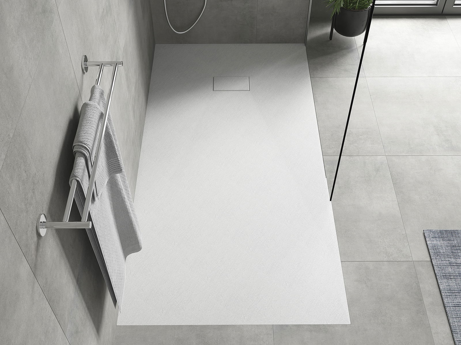 Ytan på duschbrickan påminner om sten i sin struktur. Den utgör en unik kombination av naturligt utseende med modern inredning. Den tillför karaktär, framhäver estetik och elegans i badrummets inredning och fascinerar med sin form.