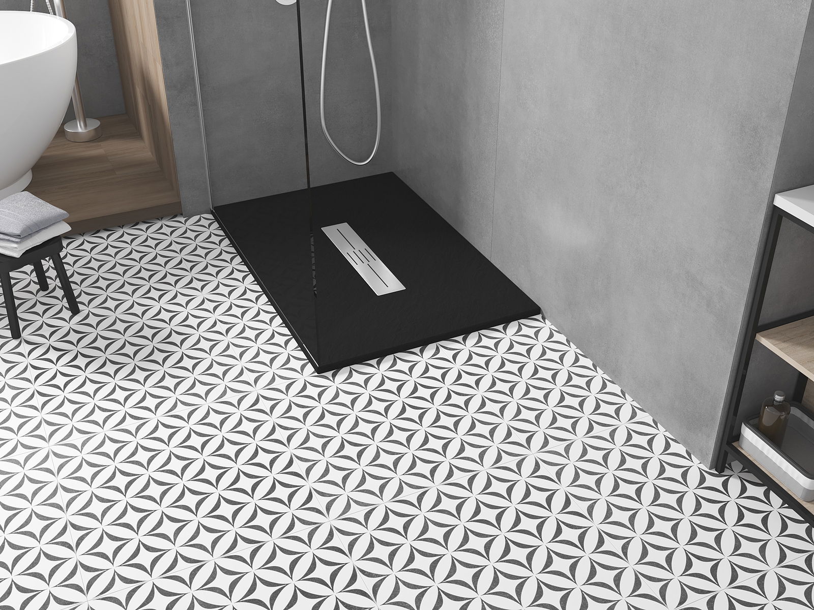 Ytan på duschbrickan påminner om sten i sin struktur. Den utgör en unik kombination av naturligt utseende med modern inredning. Den tillför karaktär, framhäver estetik och elegans i badrummets inredning och fascinerar med sin form.
