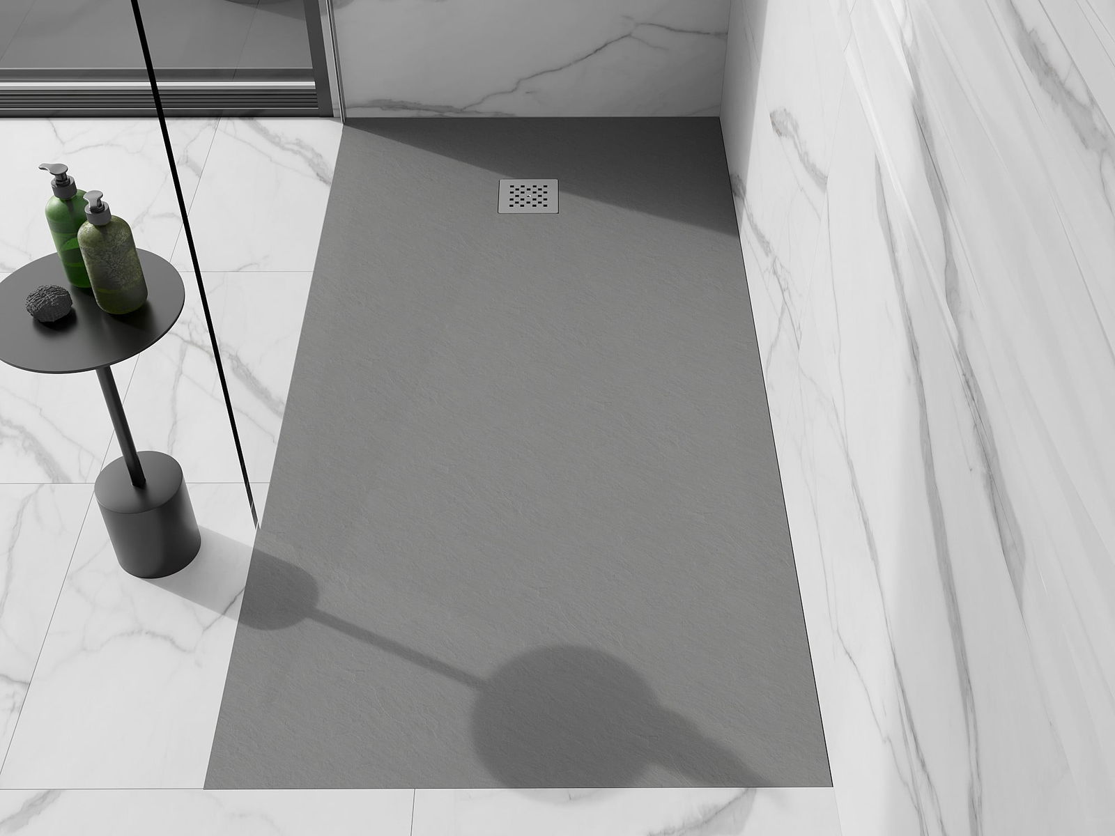 Ytan på duschbrickan påminner om sten i sin struktur. Den utgör en unik kombination av naturligt utseende med modern inredning. Den tillför karaktär, framhäver estetik och elegans i badrummets inredning och fascinerar med sin form.
