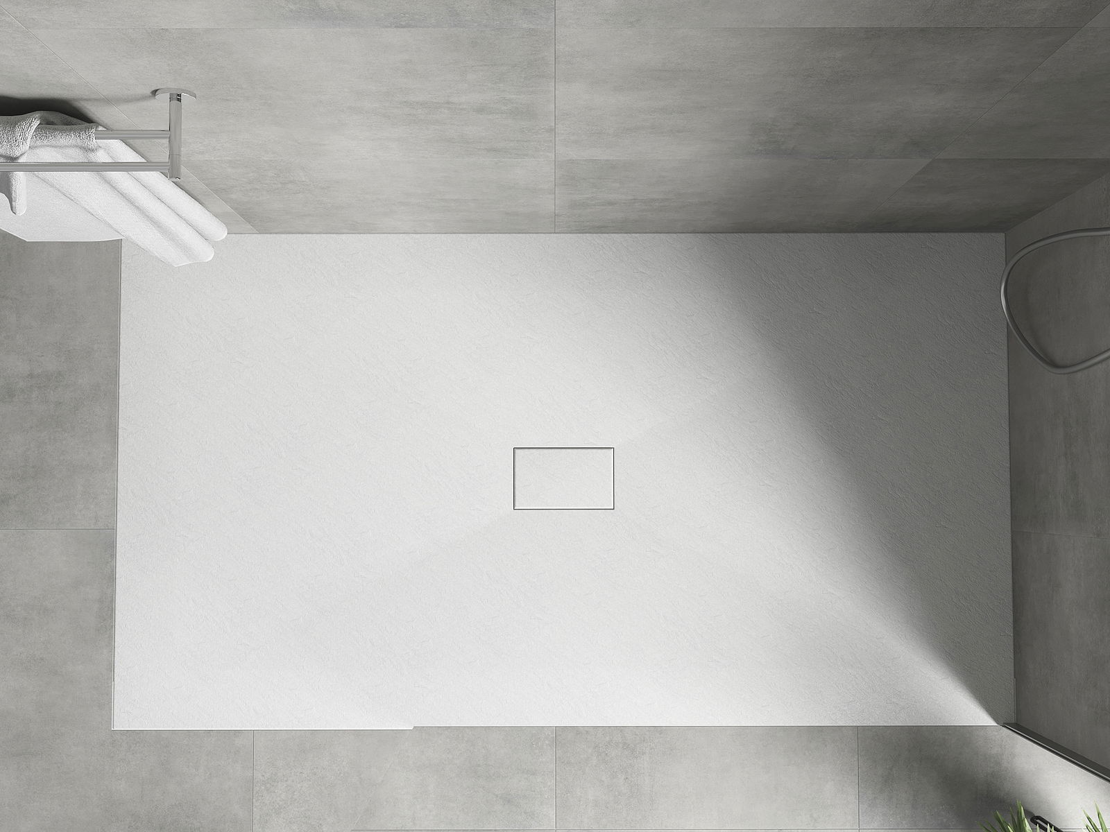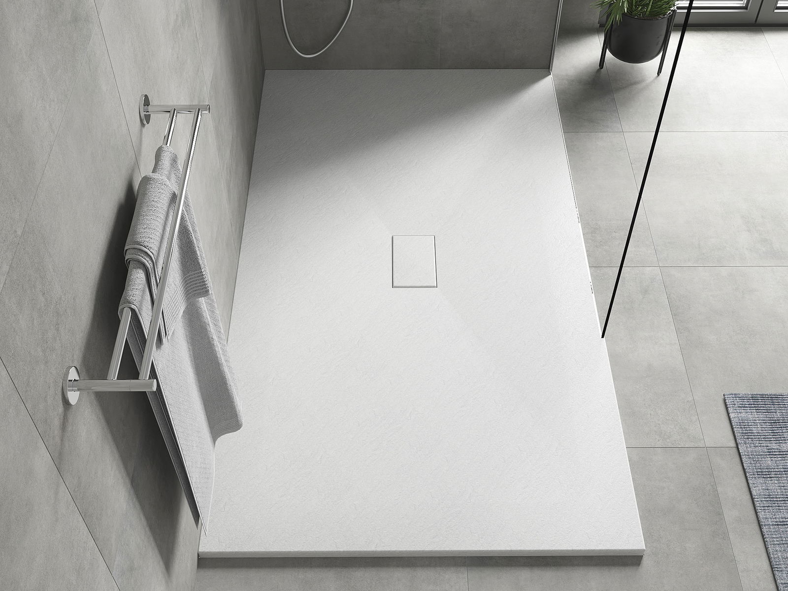 Ytan på duschbrickan påminner om sten i sin struktur. Den utgör en unik kombination av naturligt utseende med modern inredning. Den tillför karaktär, framhäver estetik och elegans i badrummets inredning och fascinerar med sin form.
