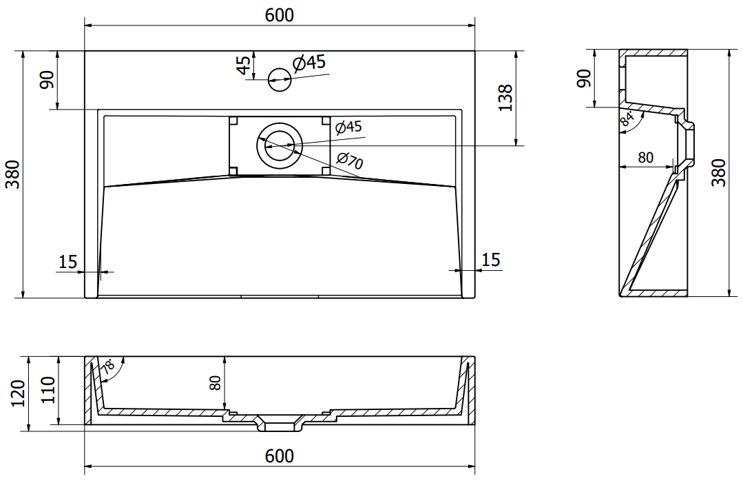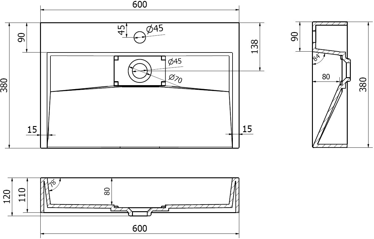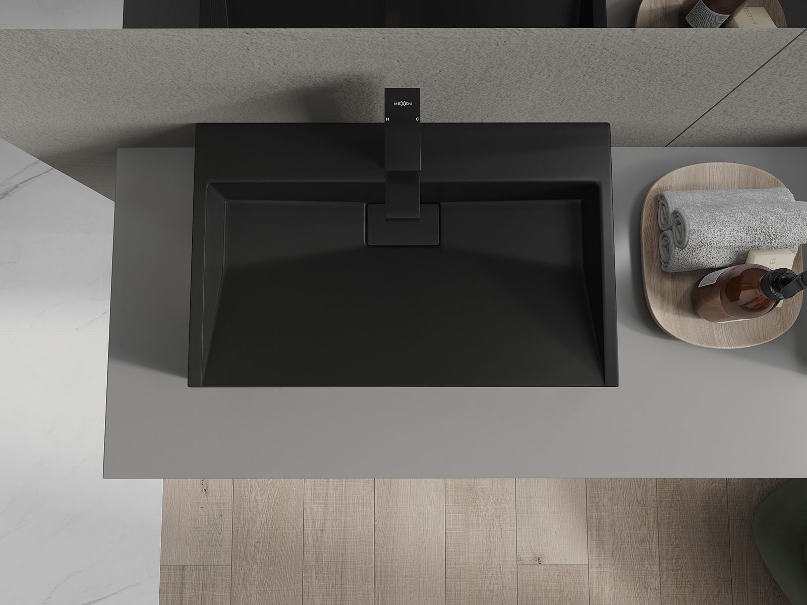 Tvättstället har ett hål där vi kan montera en kran. Detta sparar värdefull plats i badrummet och framhäver dess estetik. Denna lösning möjliggör även enklare rengöring runt tvättstället.