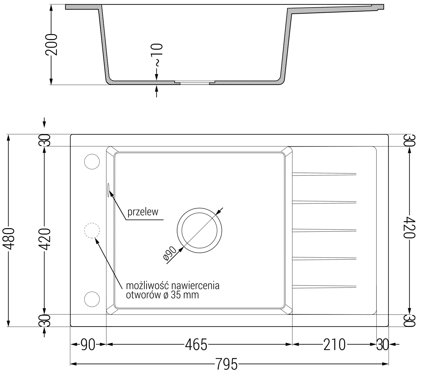 Diskhon har ett förborrat hål med en diameter på 35 mm för självständig utslagning. Det kan bland annat användas för att installera en dispenser för vätska, vilket eliminerar behovet av plastflaskor i köket och ger det en elegant finish.