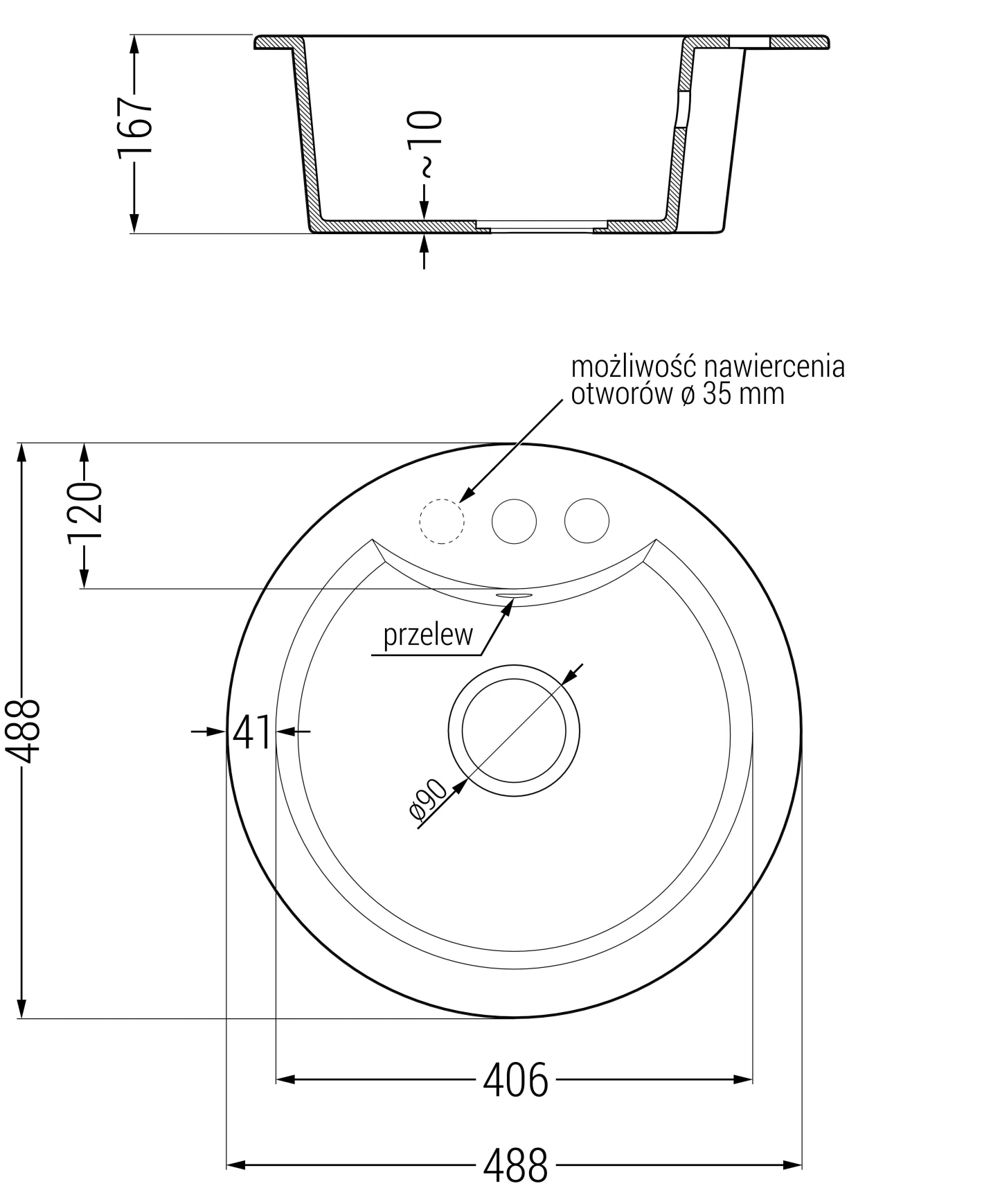 Diskhon har ett förborrat hål med en diameter på 35 mm för självständig utslagning. Det kan bland annat användas för att installera en dispenser för vätska, vilket eliminerar behovet av plastflaskor i köket och ger det en elegant finish.