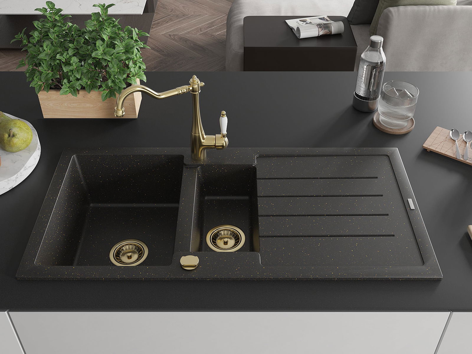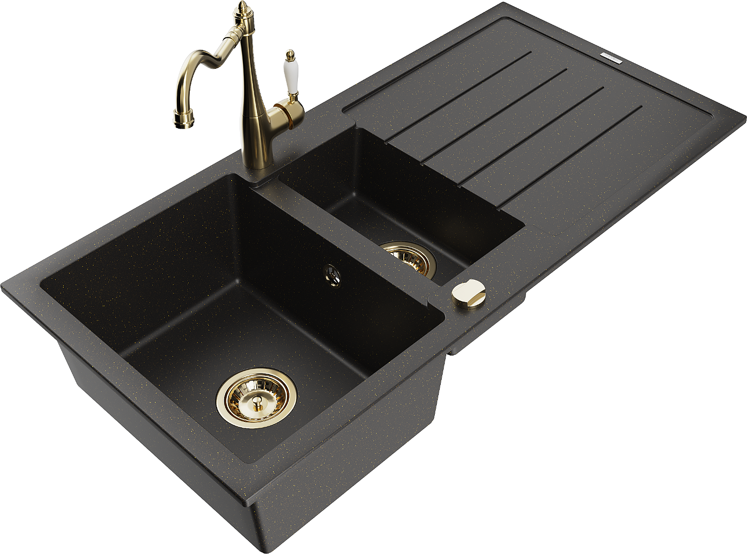 Mexen Andres Granitdiskho 1,5-facks med avrinning och köksblandare Carla, svart/guldig metallic - 6515-75-670700-50