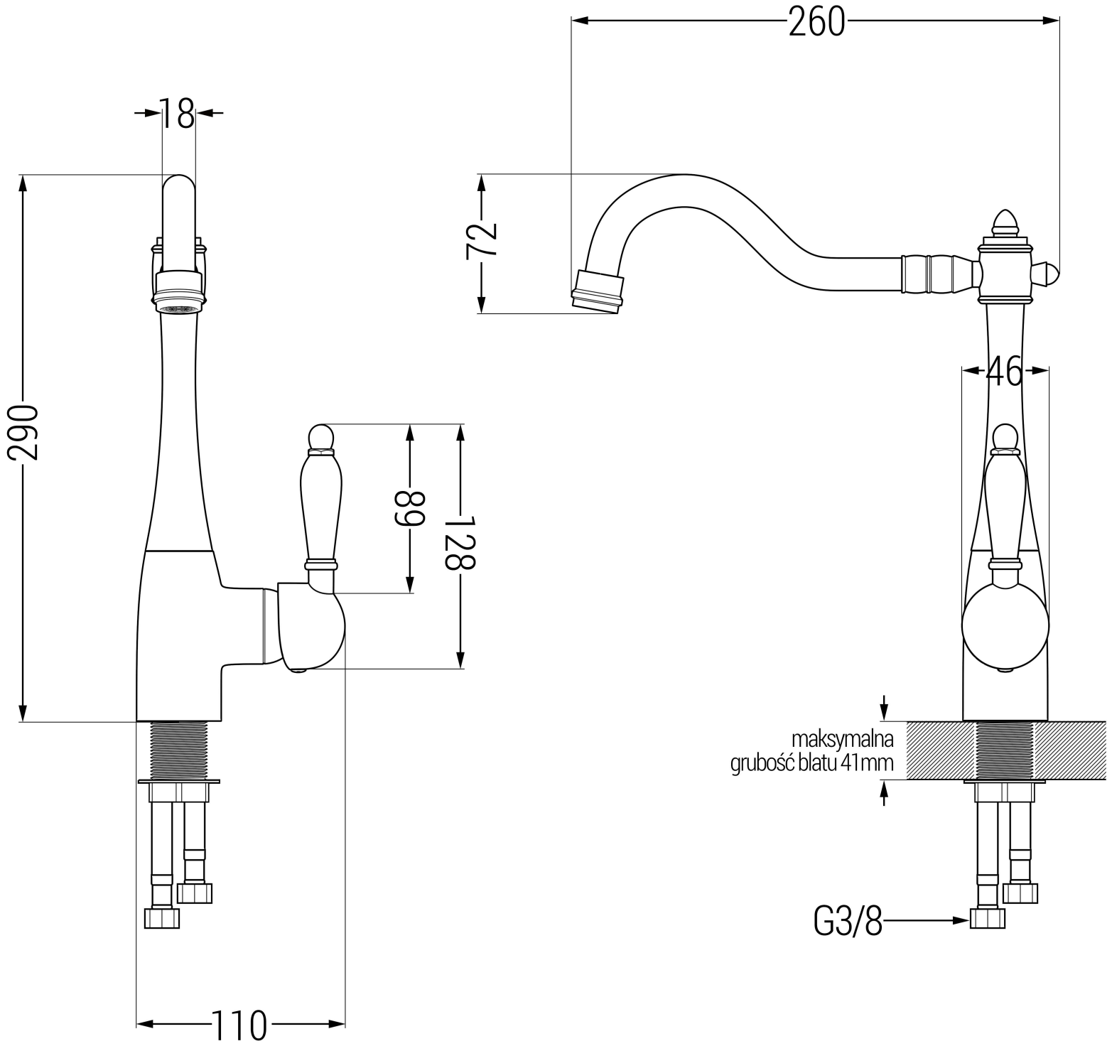 Diskbänken har 2 förberedda hål med en diameter på 35 mm, för självständig urstansning. De kan användas bl.a. för installation av en dispenser för vätska, vilket eliminerar förekomsten av plastflaskor i köket och ger det en elegant finish.