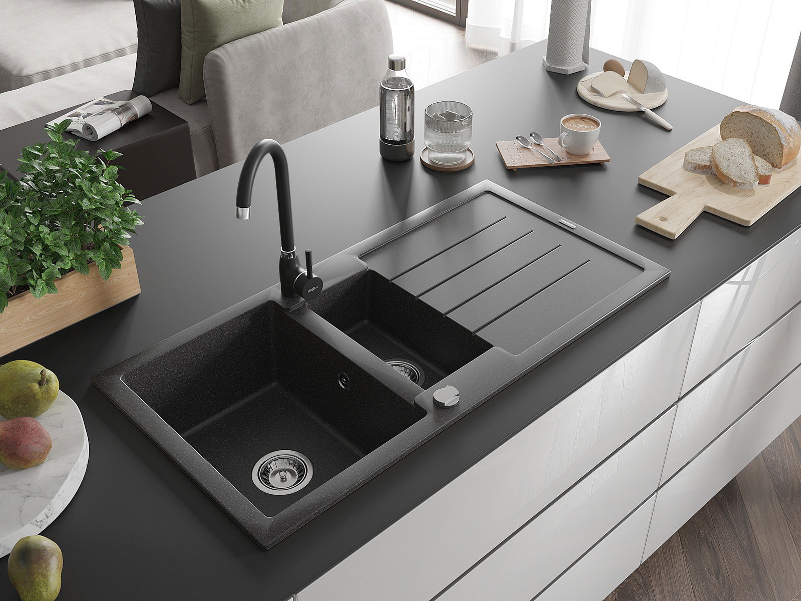 Mexen Andres granitdiskho 1,5-fack med avrinningsyta och köksblandare Telma, svart stänkt - 6515-76-670200-70