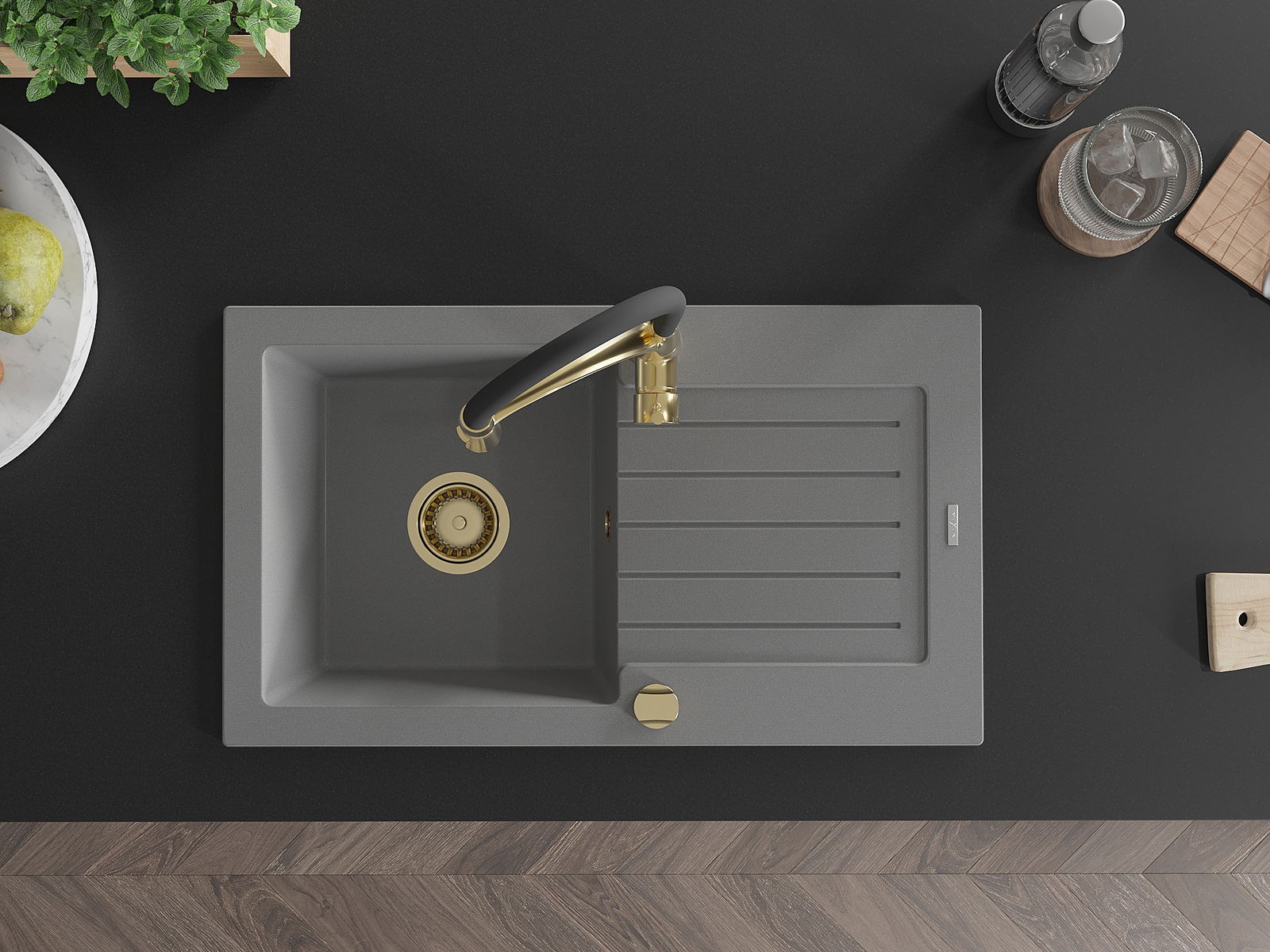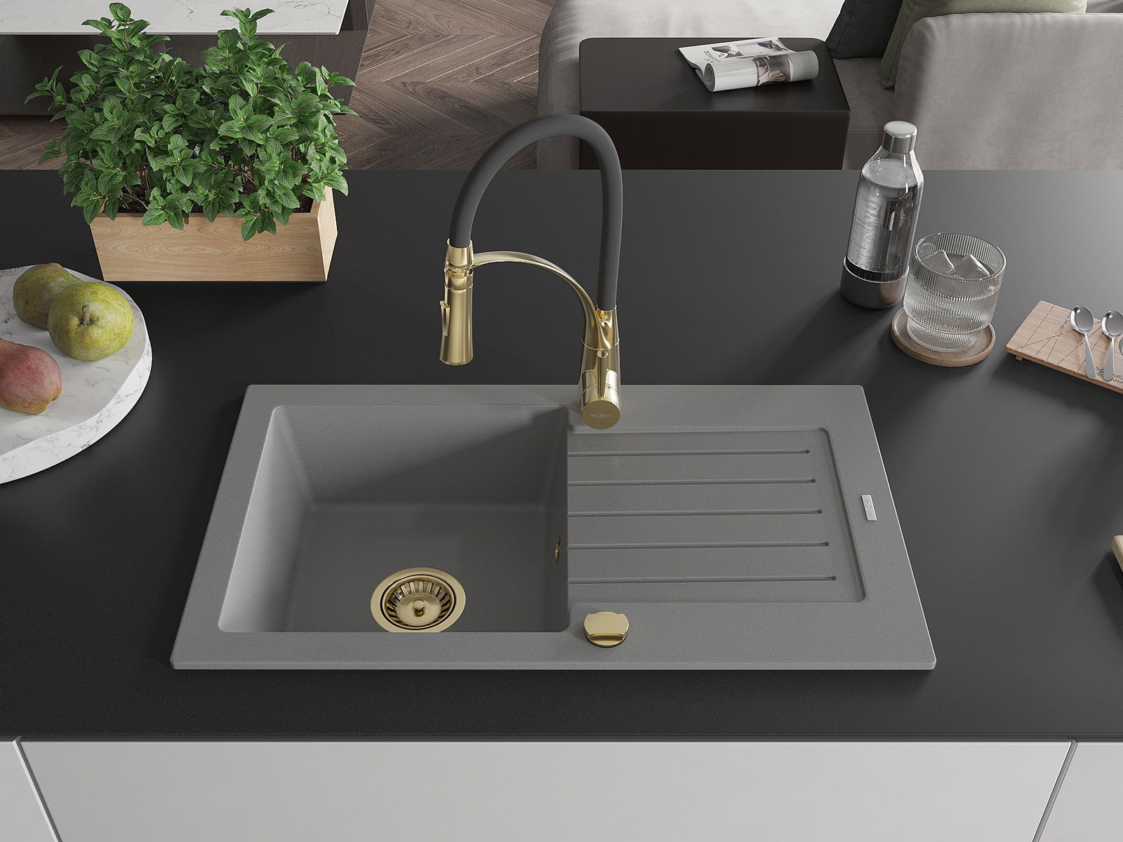 Mexen Pablo granitdiskbänk med 1 fack, avrinningsyta och köksblandare Aster, grå - 6510-71-73450-57-G