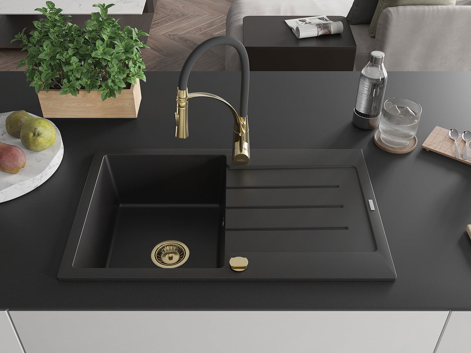 Mexen Bruno granitdiskbänk med 1-fack med avtappningsyta och kökskran Aster, svart - 6513-77-73450-57-G