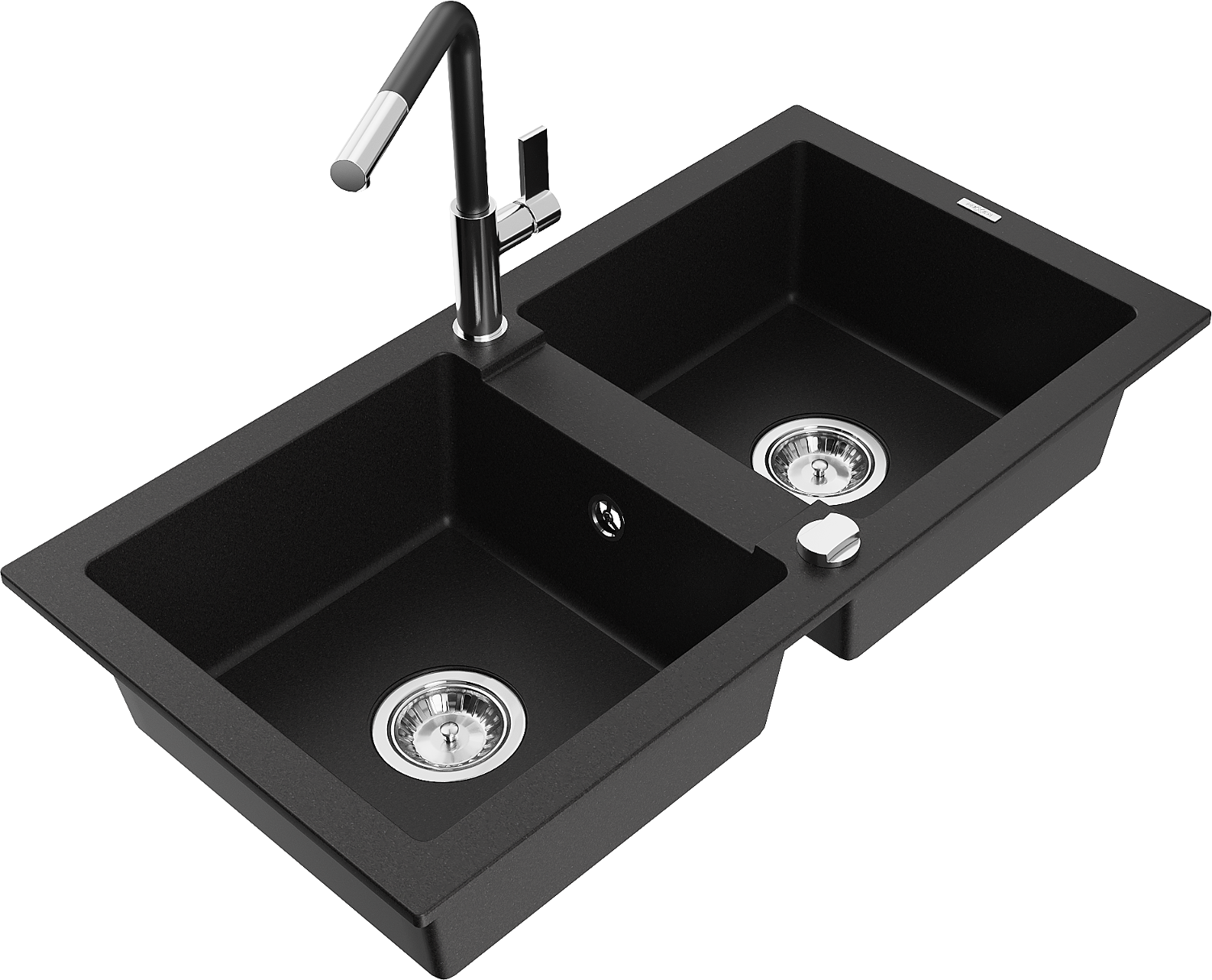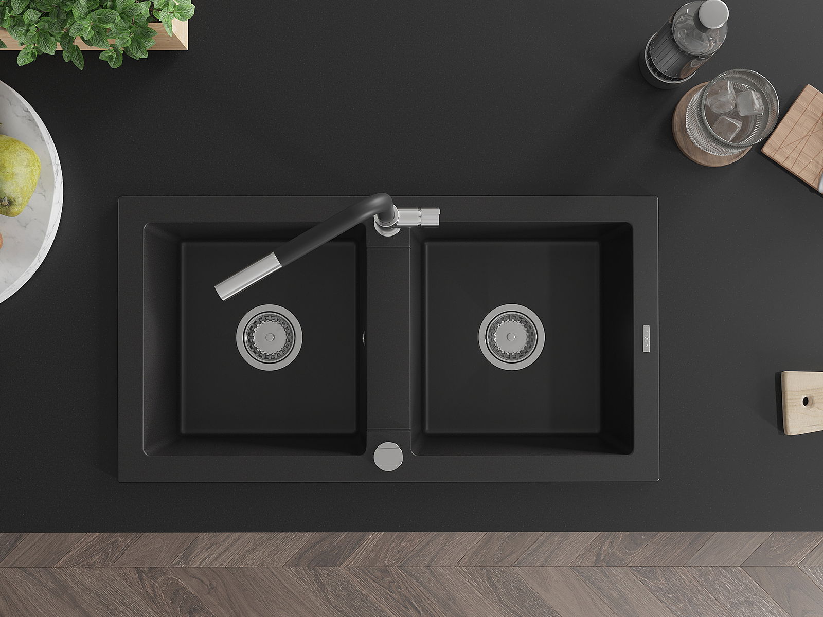 Mexen Mario granit diskbänk med 2 fack och Flora köksblandare, svart - 6504-77-670401-07