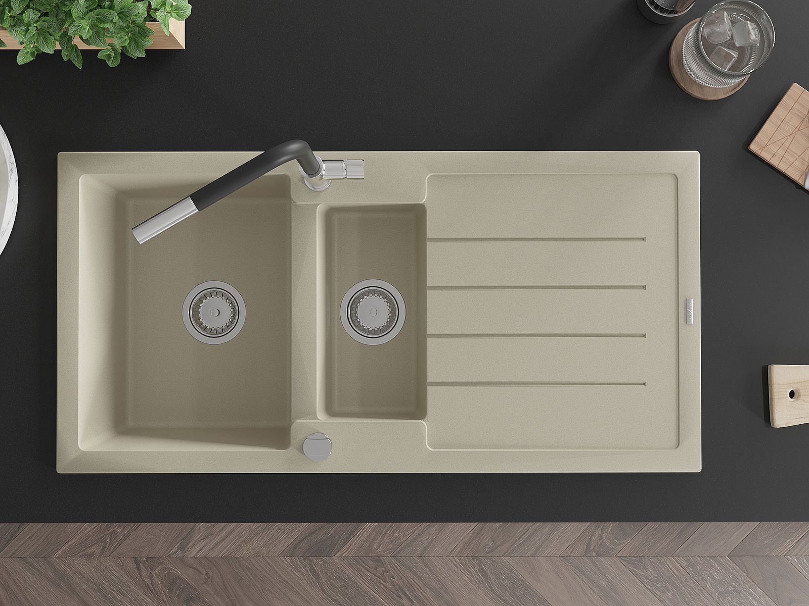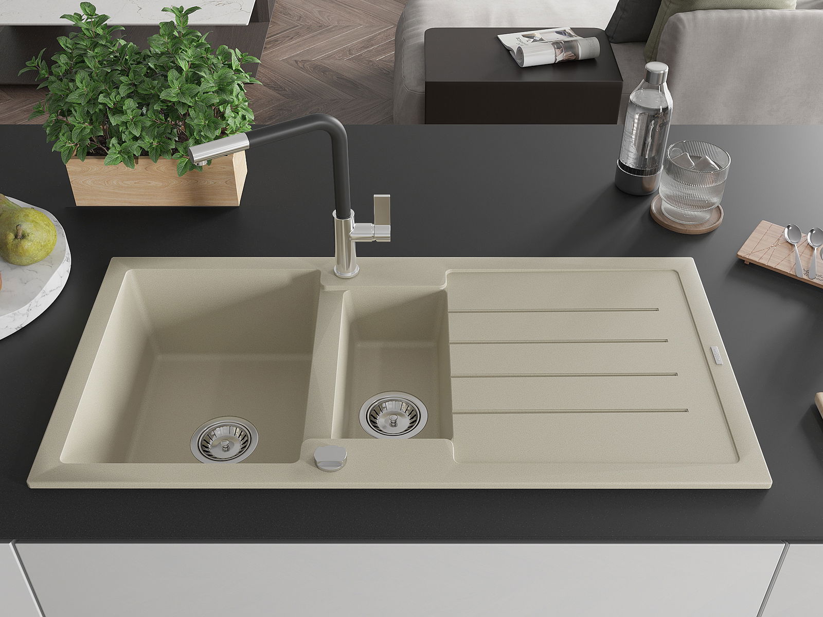 Mexen Andres granitisk diskho 1,5-kammare med avrinning och köksblandare Flora, beige - 6515-69-670401-07