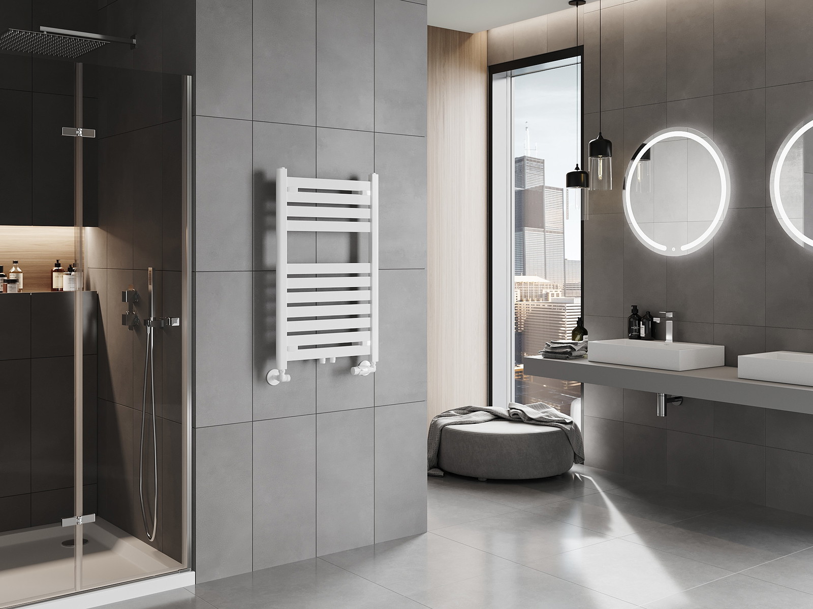 Mexen Uran är en modern badrumsradiator som utmärker sig med exceptionell funktionalitet och elegant design. Den mäter 800 mm i höjd och 500 mm i bredd och passar perfekt i alla utrymmen. Tillverkad av hållbart stål, avslutad i vit färg (RAL 9016), utgör den en tidlös lösning. Värmeeffekten på 364 W samt hög resistens mot korrosion och arbetstemperatur upp till 95 °C garanterar tillförlitlighet i många år. Praktiska anslutningsavstånd och möjlighet att montera värmeelement ökar dess universalitet. Det är ett perfekt val för moderna badrum.