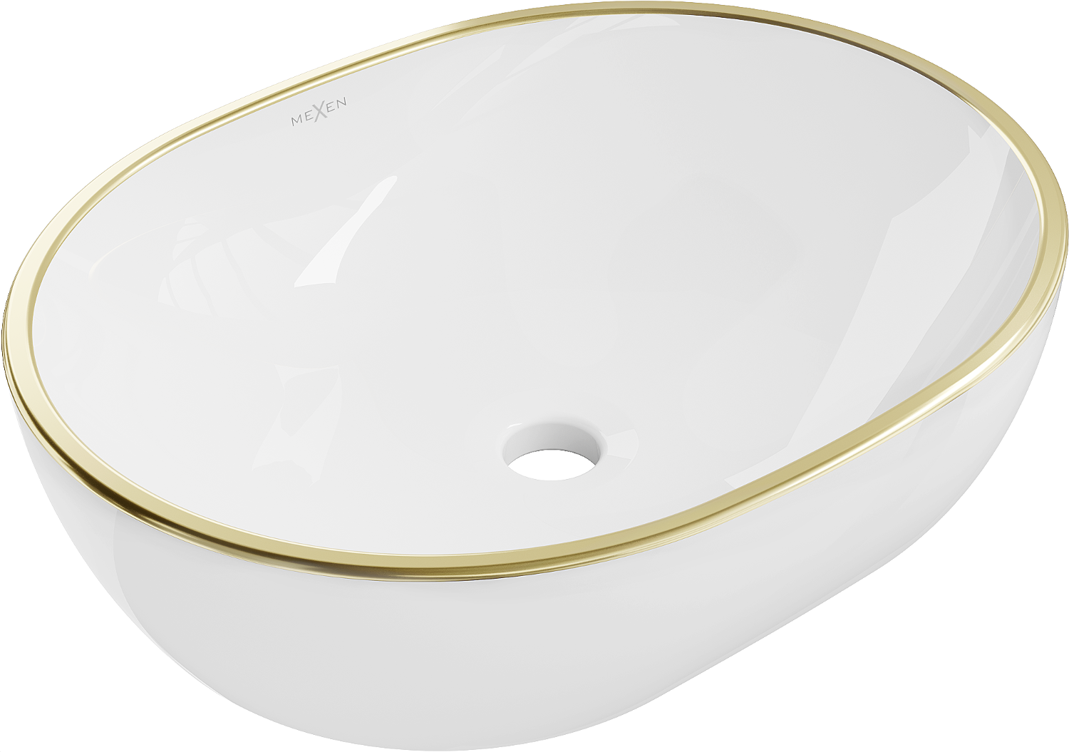 Mexen Viki är en elegant bänksskål med dimensioner på 48 x 35 cm, idealisk för moderna interiörer. Tillverkad av sanitetsporslin, kännetecknas den av en snövitt finish och en guldkant, vilket ger den ett lyxigt utseende. Skålen har ett djup på 11,5 cm och kräver inga hål för kran, vilket underlättar installationen. Tack vare den skyddande, glansiga ytan och den ovala formen passar den perfekt i varje badrum samtidigt som den erbjuder funktionalitet och estetik.