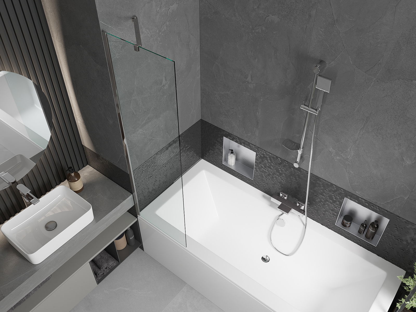 Effektivt skydd mot att vatten spills över vid bad. Skärmen har tätningar som perfekt anpassar sig till glasytan och badkarskanten. En funktionell lösning som garanterar säkerhet och enkel rengöring.