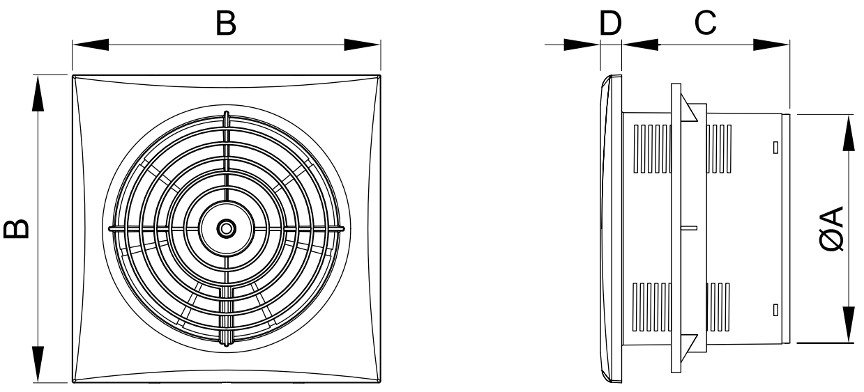 - Kullager som ger lång livslängd, högre effektivitet och möjliggör installation i valfri position (på vägg eller tak)