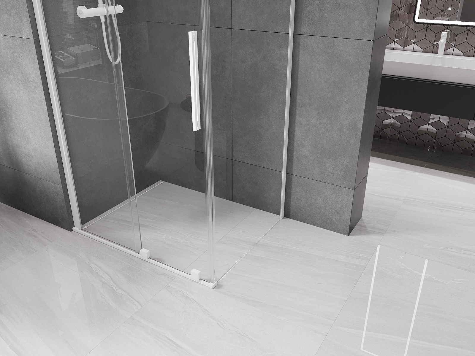 Det praktiska och bekväma handtaget är tillverkat av rostfritt stål. Den moderna formen i kombination med en finish som matchar profilernas färg ger helheten ett modernt och stiligt utseende, vilket framhäver estetiken i varje badrum.