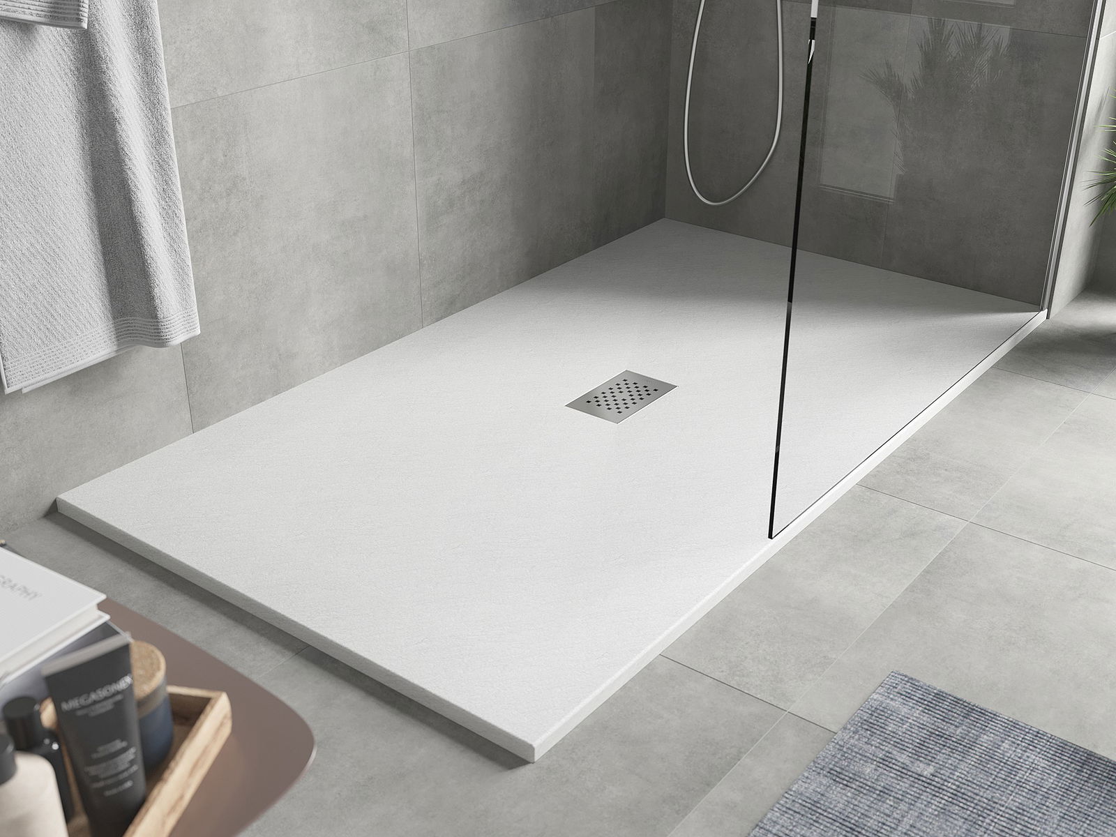 Ytan på duschbrickan påminner om sten i sin struktur. Den utgör en unik kombination av naturligt utseende med modern inredning. Den tillför karaktär, framhäver estetik och elegans i badrummets inredning och fascinerar med sin form.