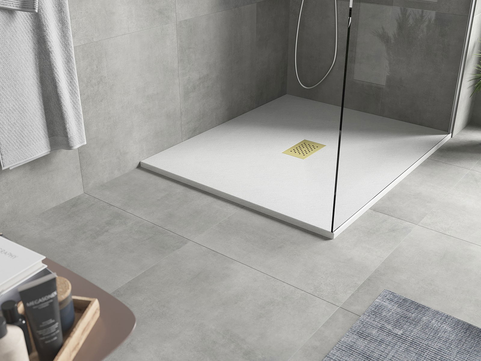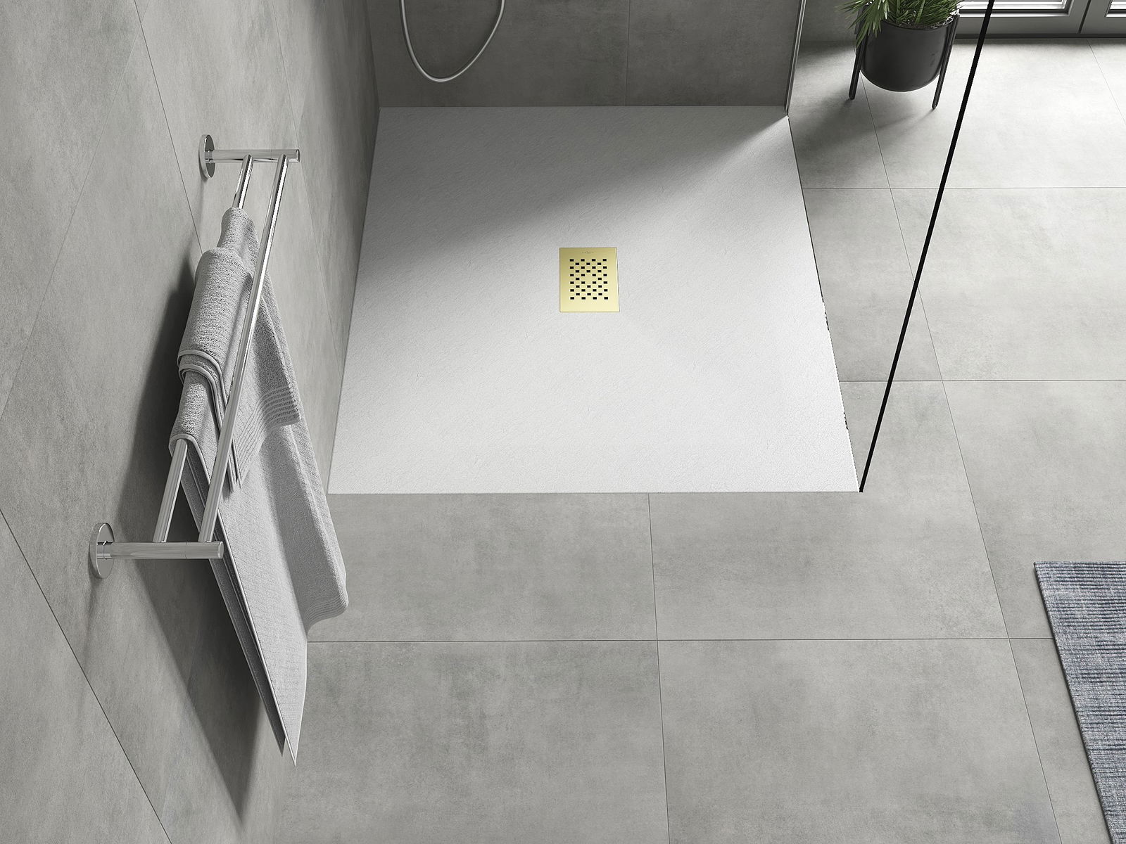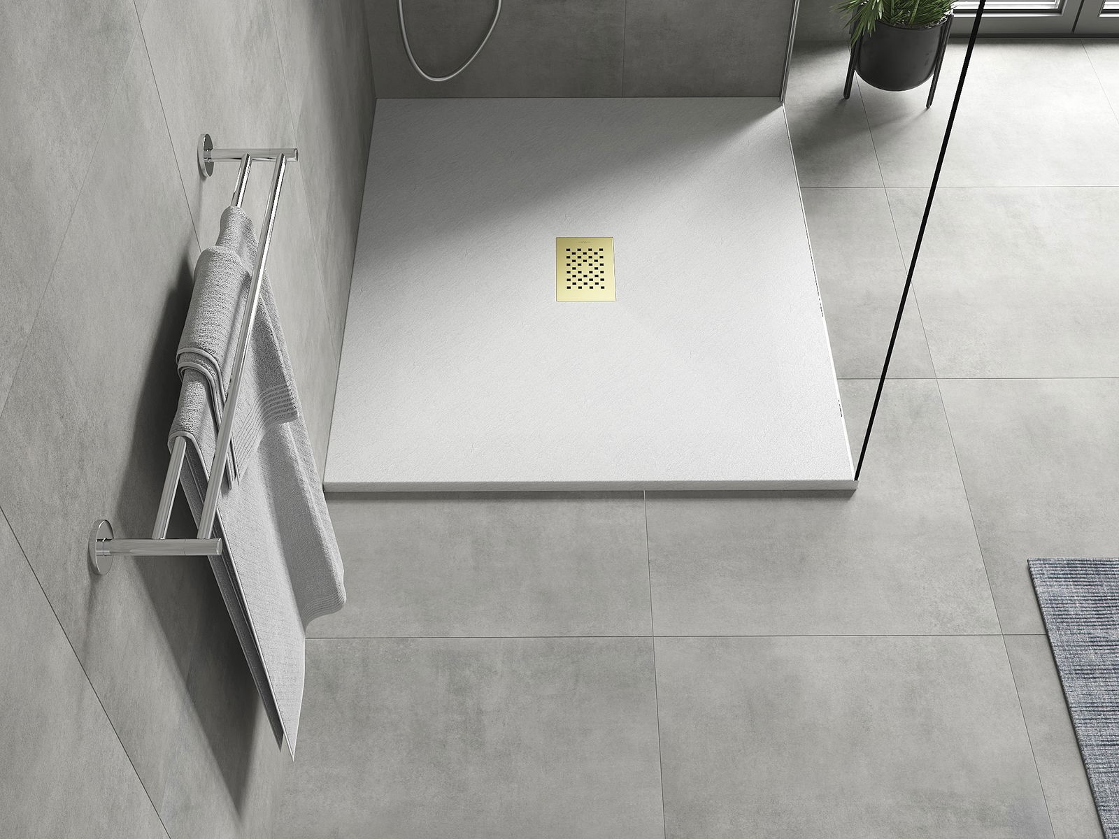 Ytan på duschbrickan påminner om sten i sin struktur. Den utgör en unik kombination av naturligt utseende med modern inredning. Den tillför karaktär, framhäver estetik och elegans i badrummets inredning och fascinerar med sin form.