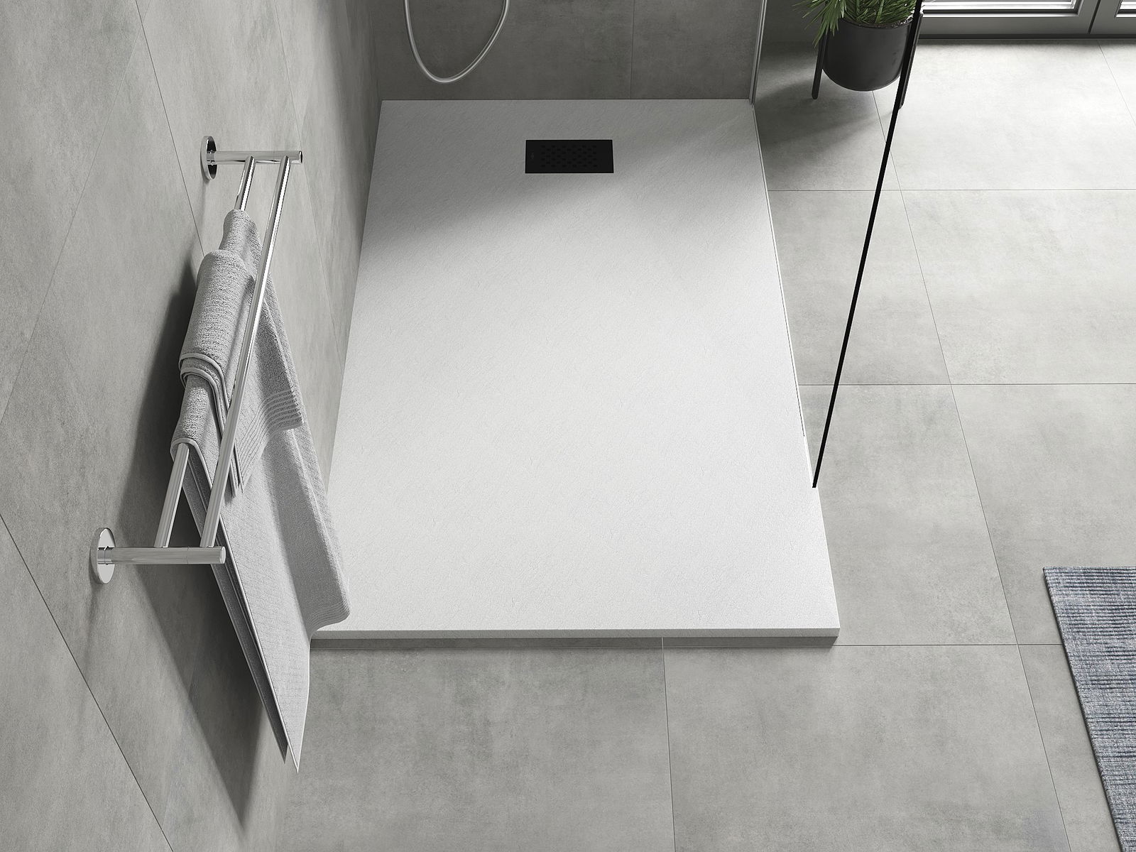Ytan på duschbrickan påminner om sten i sin struktur. Den utgör en unik kombination av naturligt utseende med modern inredning. Den tillför karaktär, framhäver estetik och elegans i badrummets inredning och fascinerar med sin form.