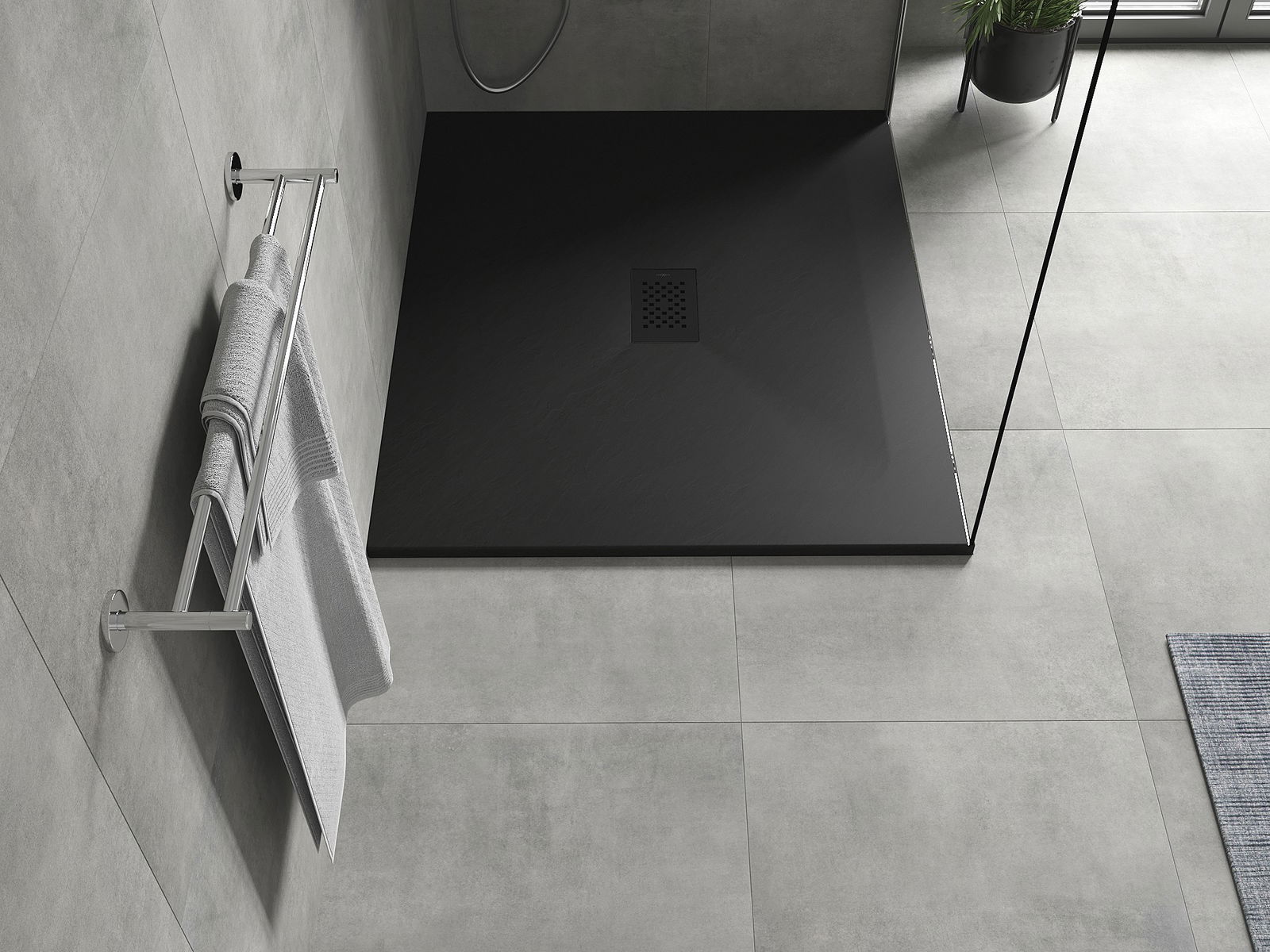 Ytan på duschbrickan påminner om sten i sin struktur. Den utgör en unik kombination av naturligt utseende med modern inredning. Den tillför karaktär, framhäver estetik och elegans i badrummets inredning och fascinerar med sin form.