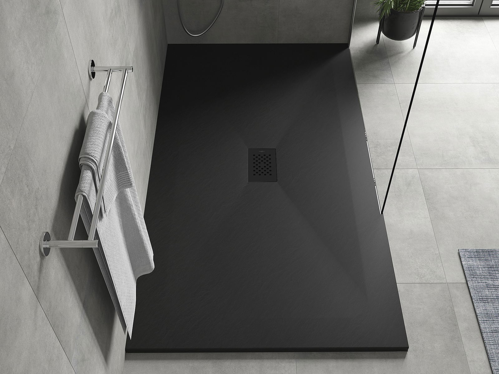 Ytan på duschbrickan påminner om sten i sin struktur. Den utgör en unik kombination av naturligt utseende med modern inredning. Den tillför karaktär, framhäver estetik och elegans i badrummets inredning och fascinerar med sin form.