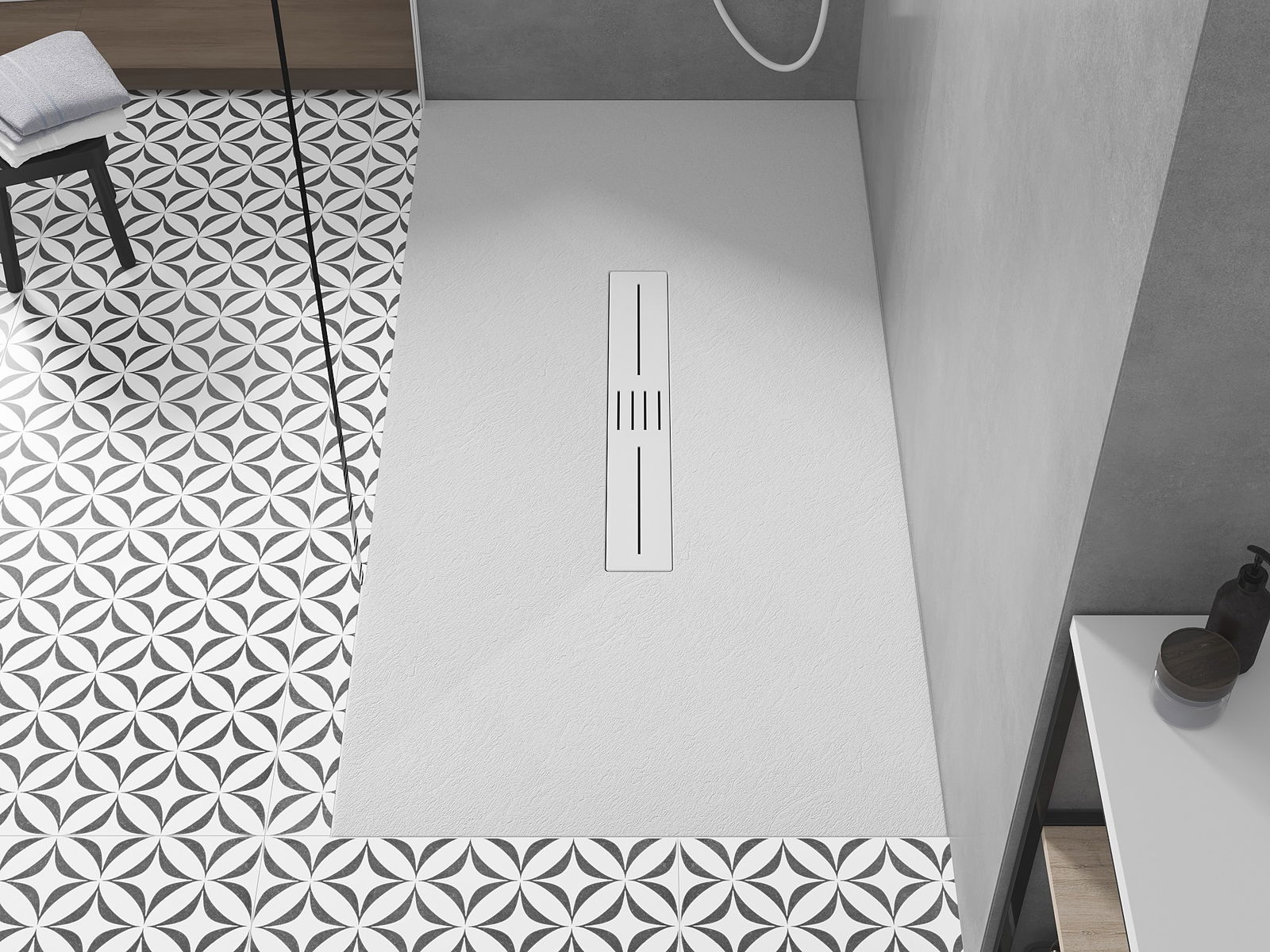 Ytan på duschbrickan påminner om sten i sin struktur. Den utgör en unik kombination av naturligt utseende med modern inredning. Den tillför karaktär, framhäver estetik och elegans i badrummets inredning och fascinerar med sin form.