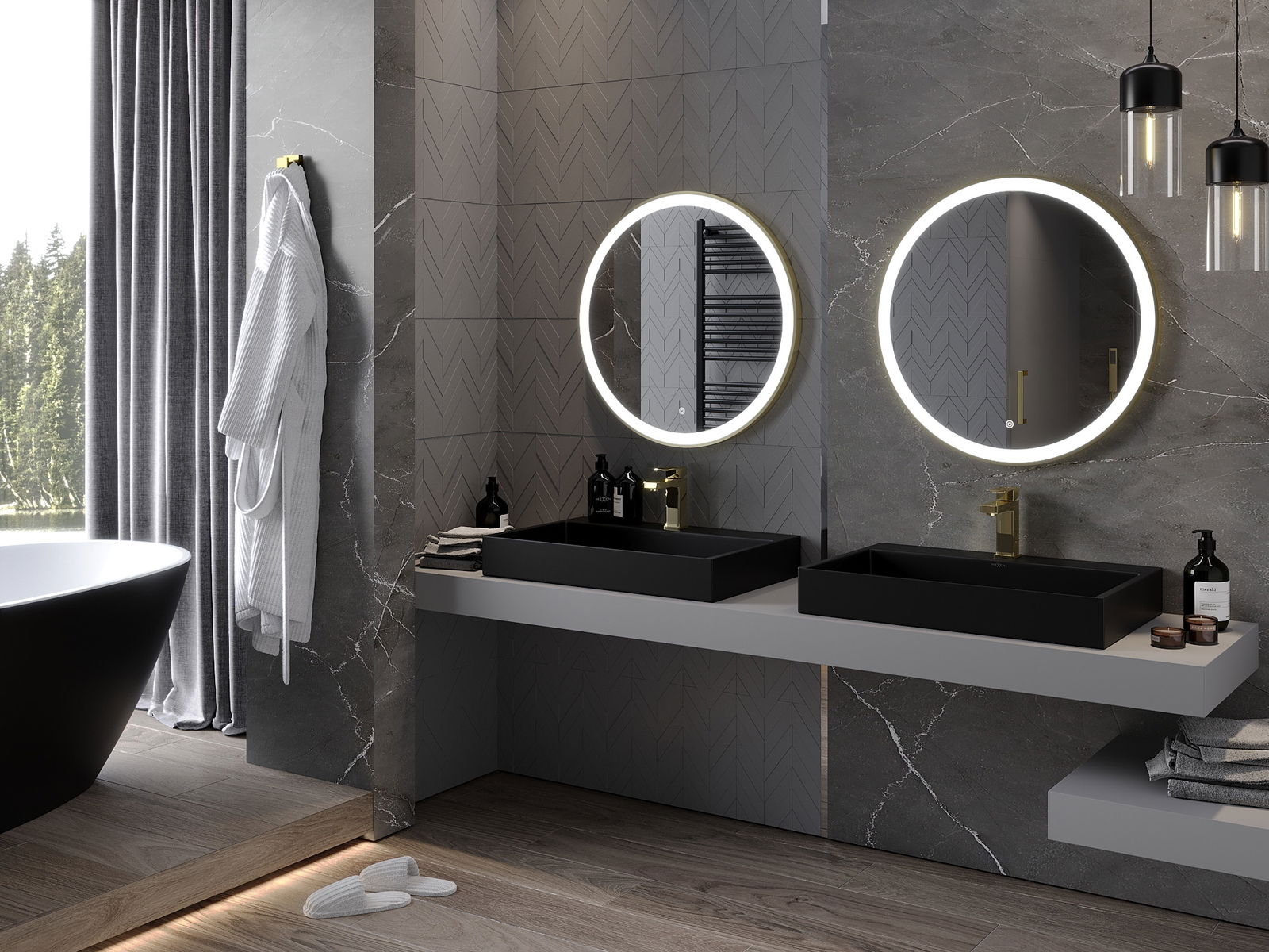 LED-belysning vid spegeln är ett praktiskt inslag som underlättar daglig vård genom möjligheten till idealisk ansiktsbelysning. Belysningen ger badrummet en modern finish och framhäver dess eleganta inredning.