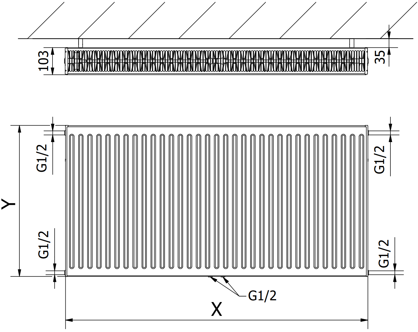 Avstånd mellan vertikala vattenkanaler: 33,3 mm