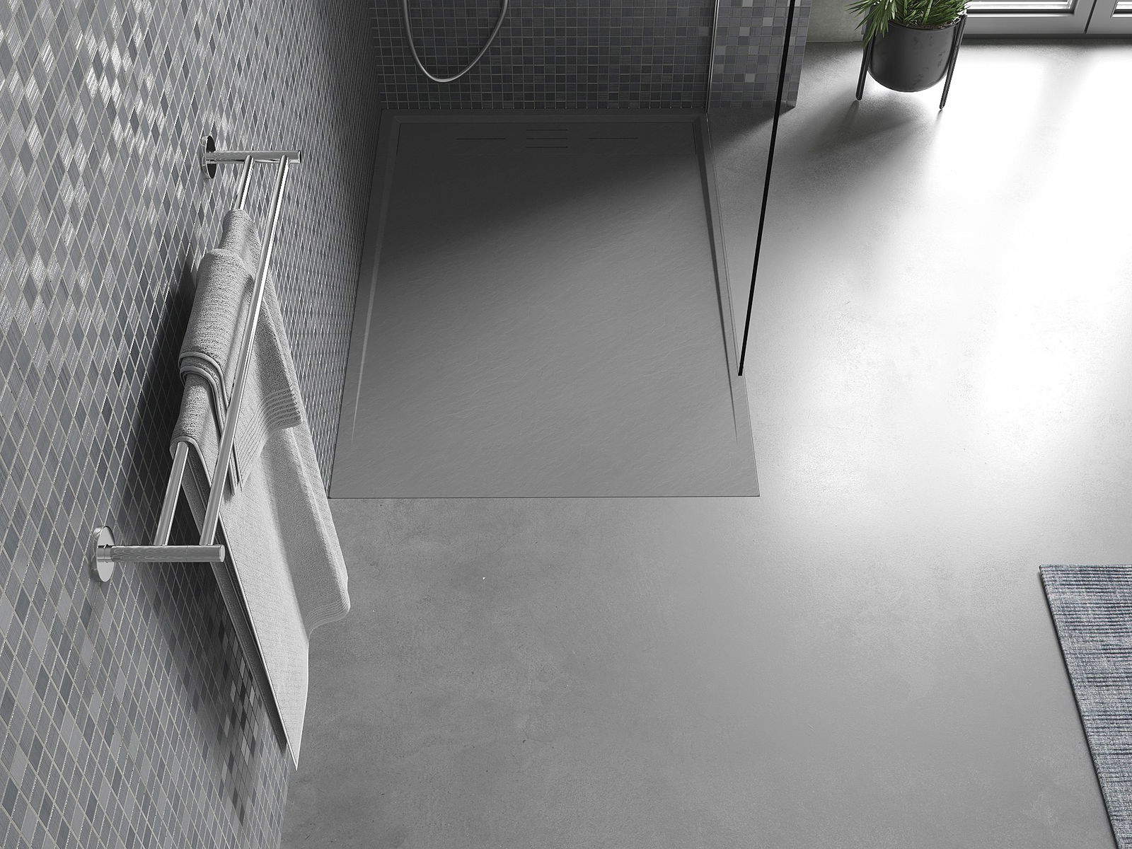 Ytan på duschbrickan påminner om sten i sin struktur. Den utgör en unik kombination av naturligt utseende med modern inredning. Den tillför karaktär, framhäver estetik och elegans i badrummets inredning och fascinerar med sin form.