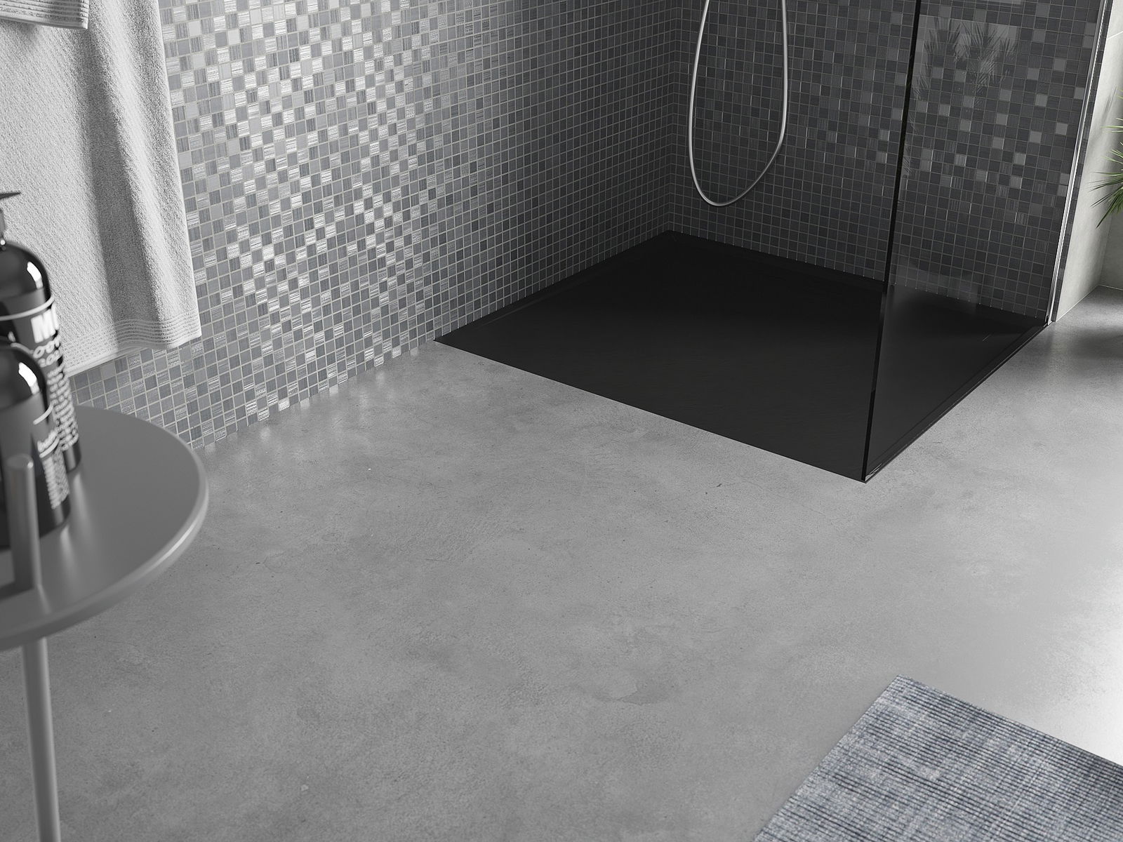 Ytan på duschbrickan påminner om sten i sin struktur. Den utgör en unik kombination av naturligt utseende med modern inredning. Den tillför karaktär, framhäver estetik och elegans i badrummets inredning och fascinerar med sin form.