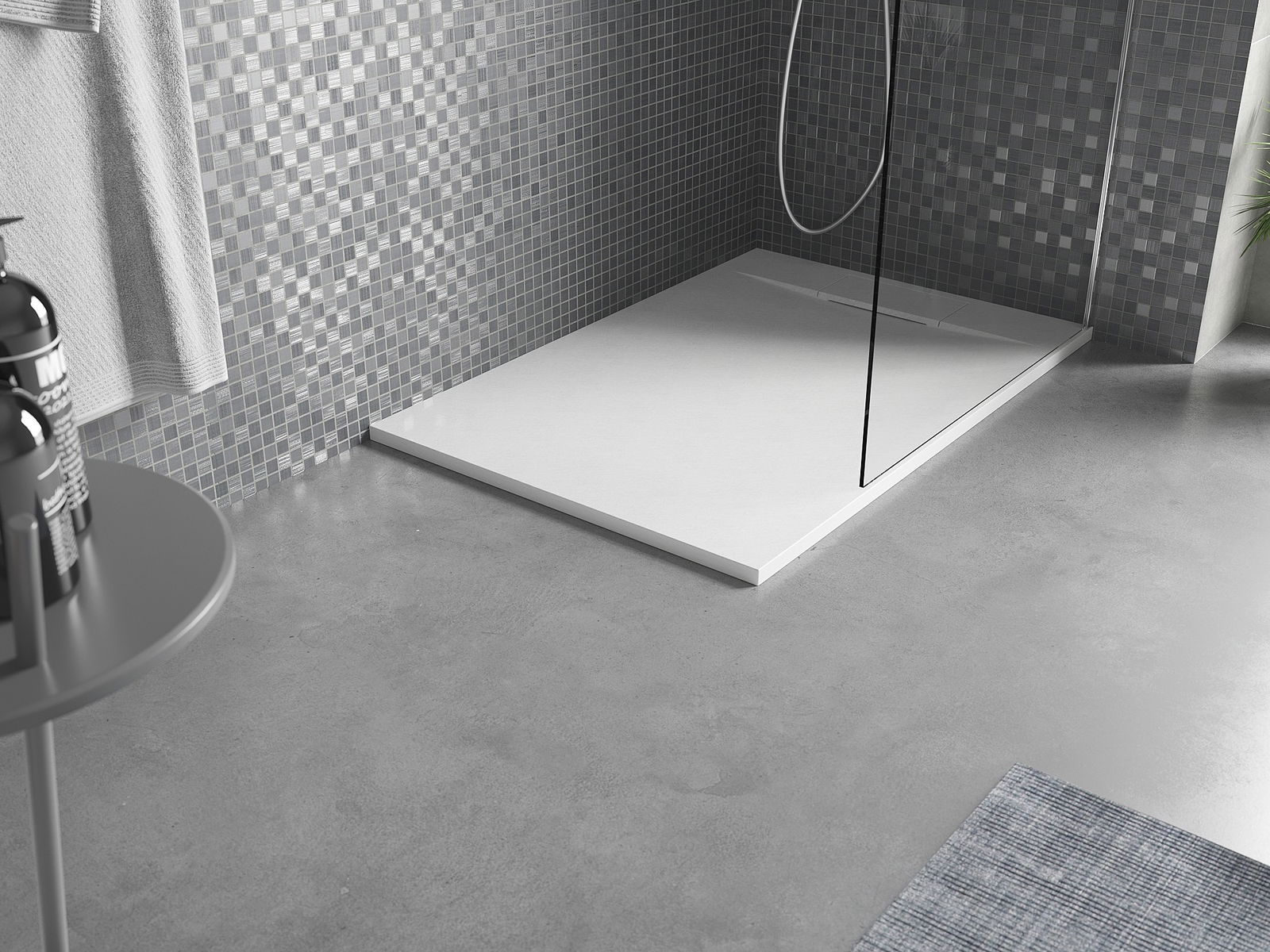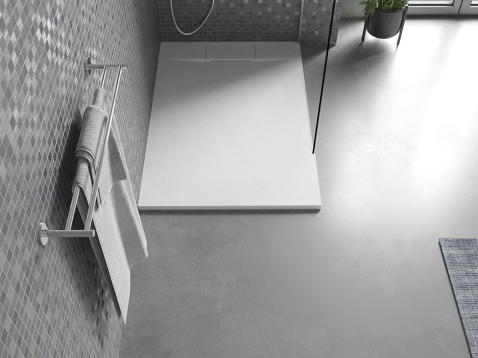 Ytan på duschbrickan påminner om sten i sin struktur. Den utgör en unik kombination av naturligt utseende med modern inredning. Den tillför karaktär, framhäver estetik och elegans i badrummets inredning och fascinerar med sin form.