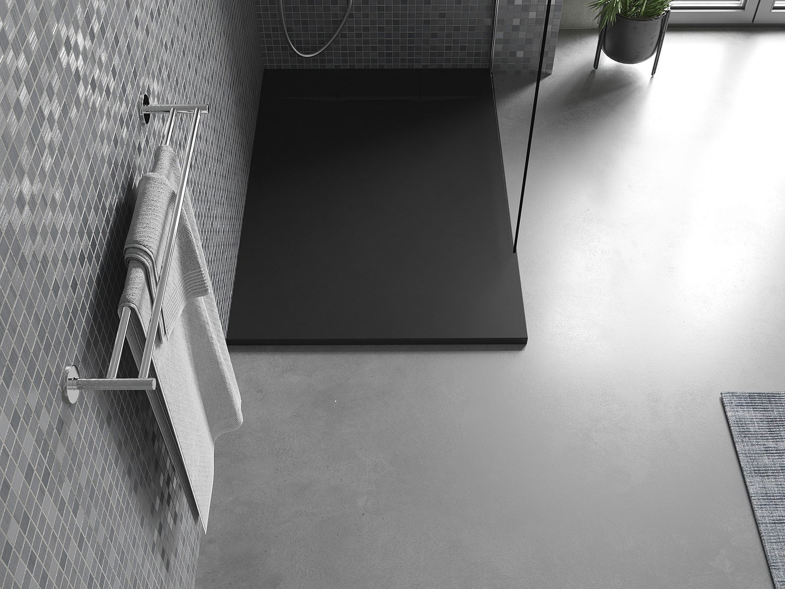 Ytan på duschbrickan påminner om sten i sin struktur. Den utgör en unik kombination av naturligt utseende med modern inredning. Den tillför karaktär, framhäver estetik och elegans i badrummets inredning och fascinerar med sin form.