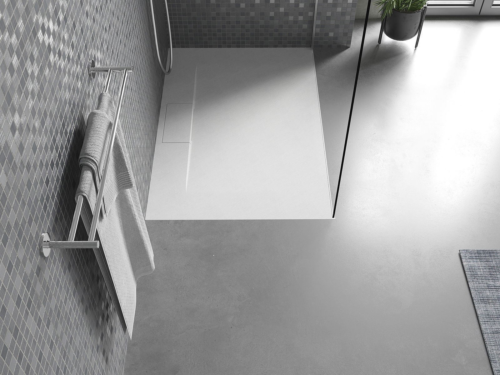 Ytan på duschbrickan påminner om sten i sin struktur. Den utgör en unik kombination av naturligt utseende med modern inredning. Den tillför karaktär, framhäver estetik och elegans i badrummets inredning och fascinerar med sin form.