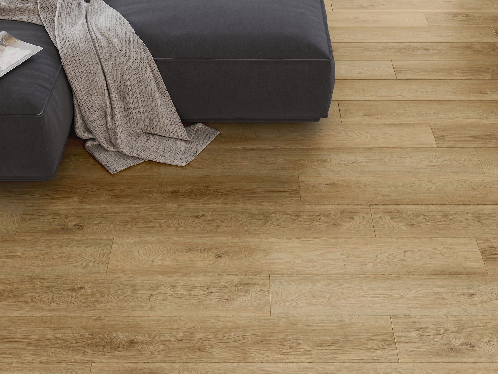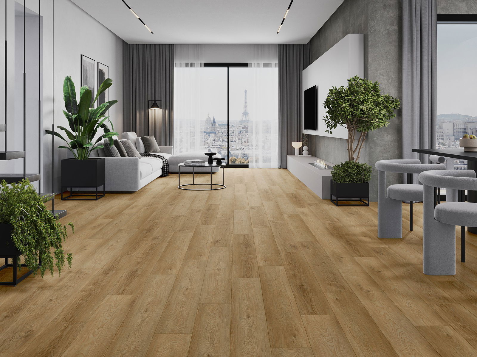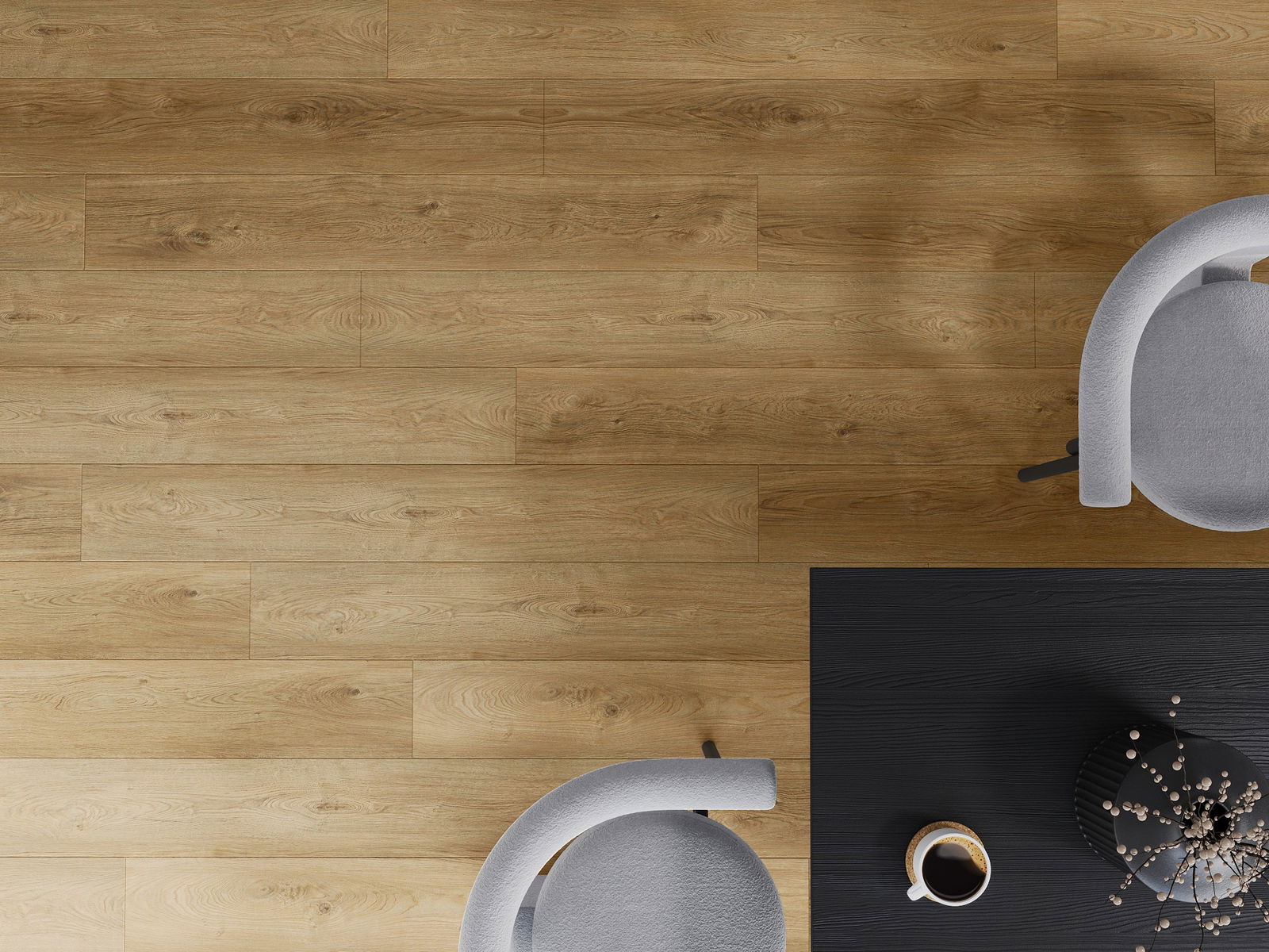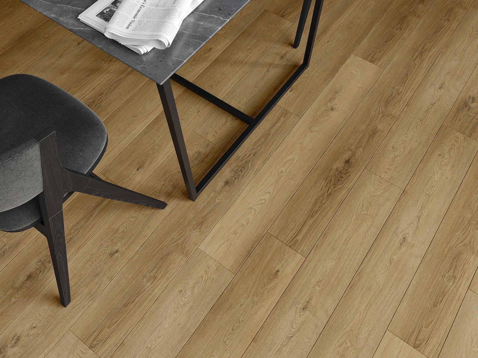 Panelerna har en 4-sidig fog - varje sida har frästs på ett sådant sätt att en V-formad fog skapas när de läggs. Denna design gör att golvet får en tydligare struktur, vilket ger det djup och estetisk karaktär. Denna effekt är särskilt uppskattad i moderna inredningar, där detaljerna betonar interiörens unika utseende.