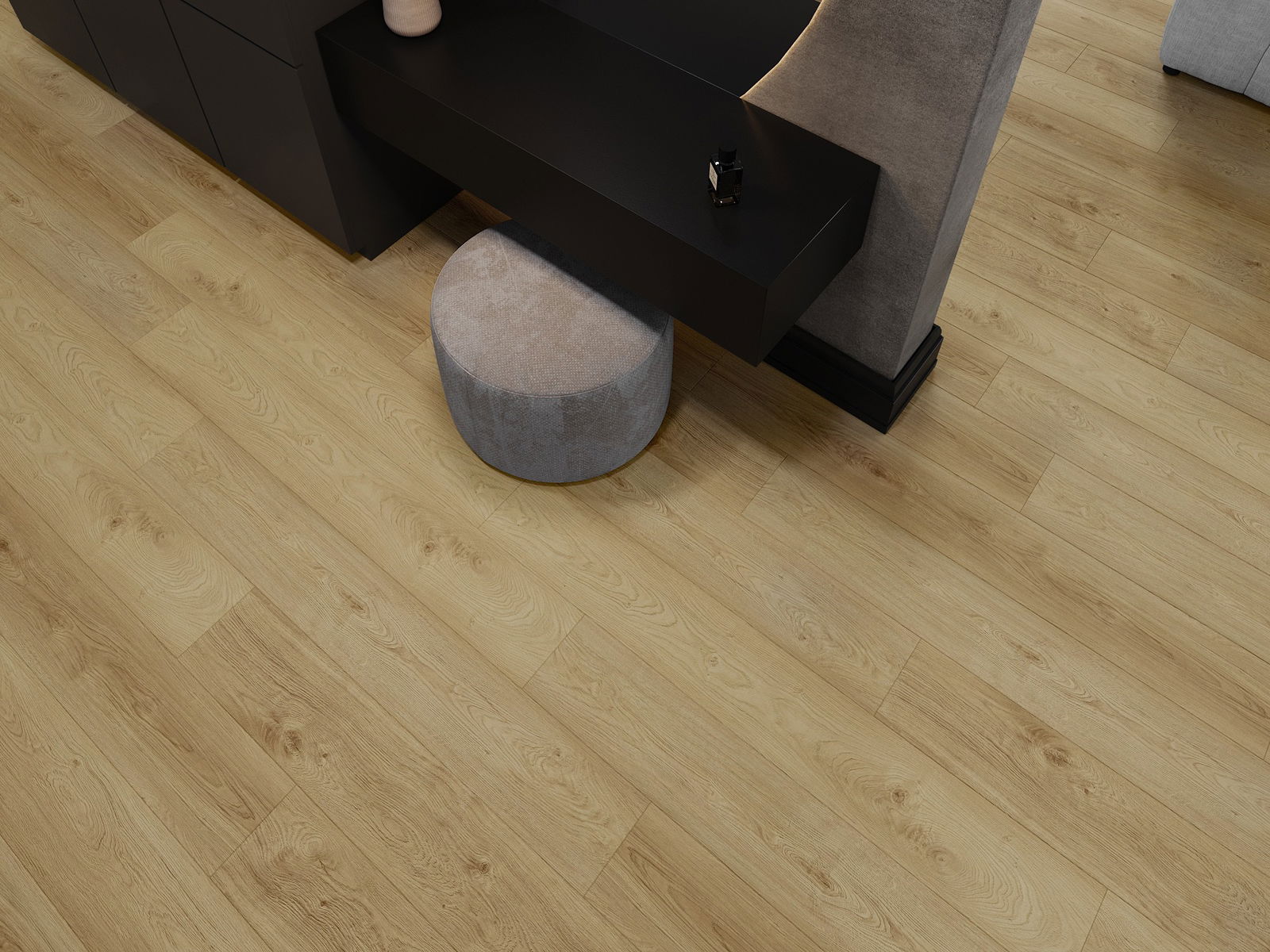 Panelerna har en 4-sidig fog - varje sida har frästs på ett sådant sätt att en V-formad fog skapas när de läggs. Denna design gör att golvet får en tydligare struktur, vilket ger det djup och estetisk karaktär. Denna effekt är särskilt uppskattad i moderna inredningar, där detaljerna betonar interiörens unika utseende.