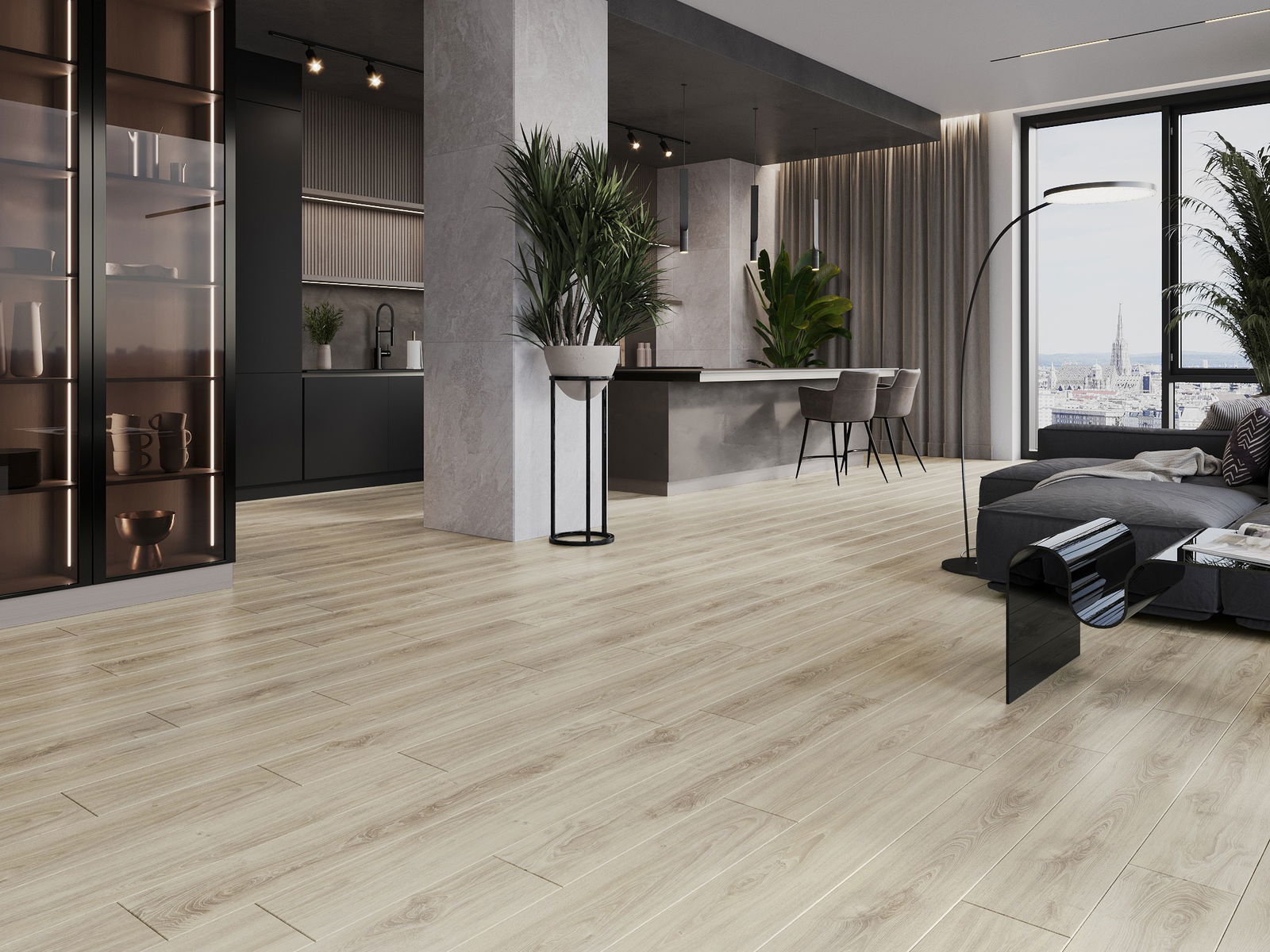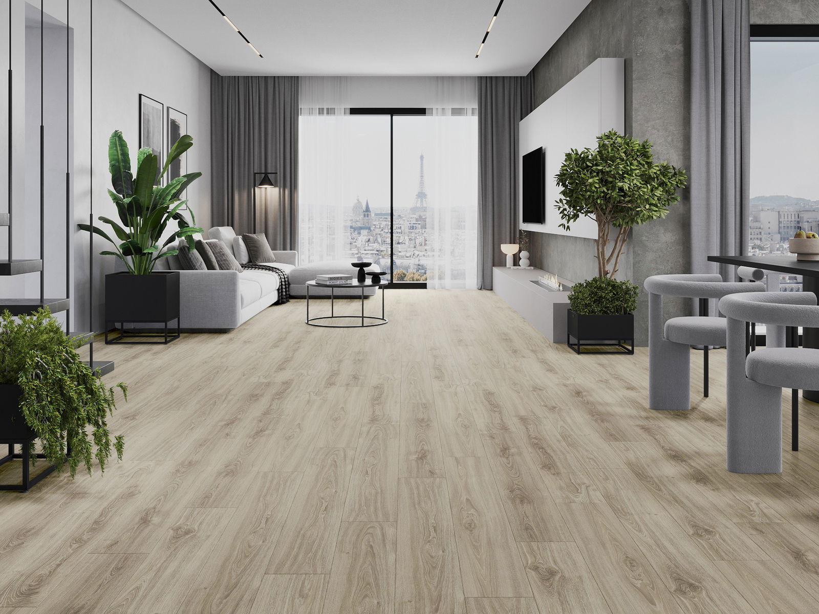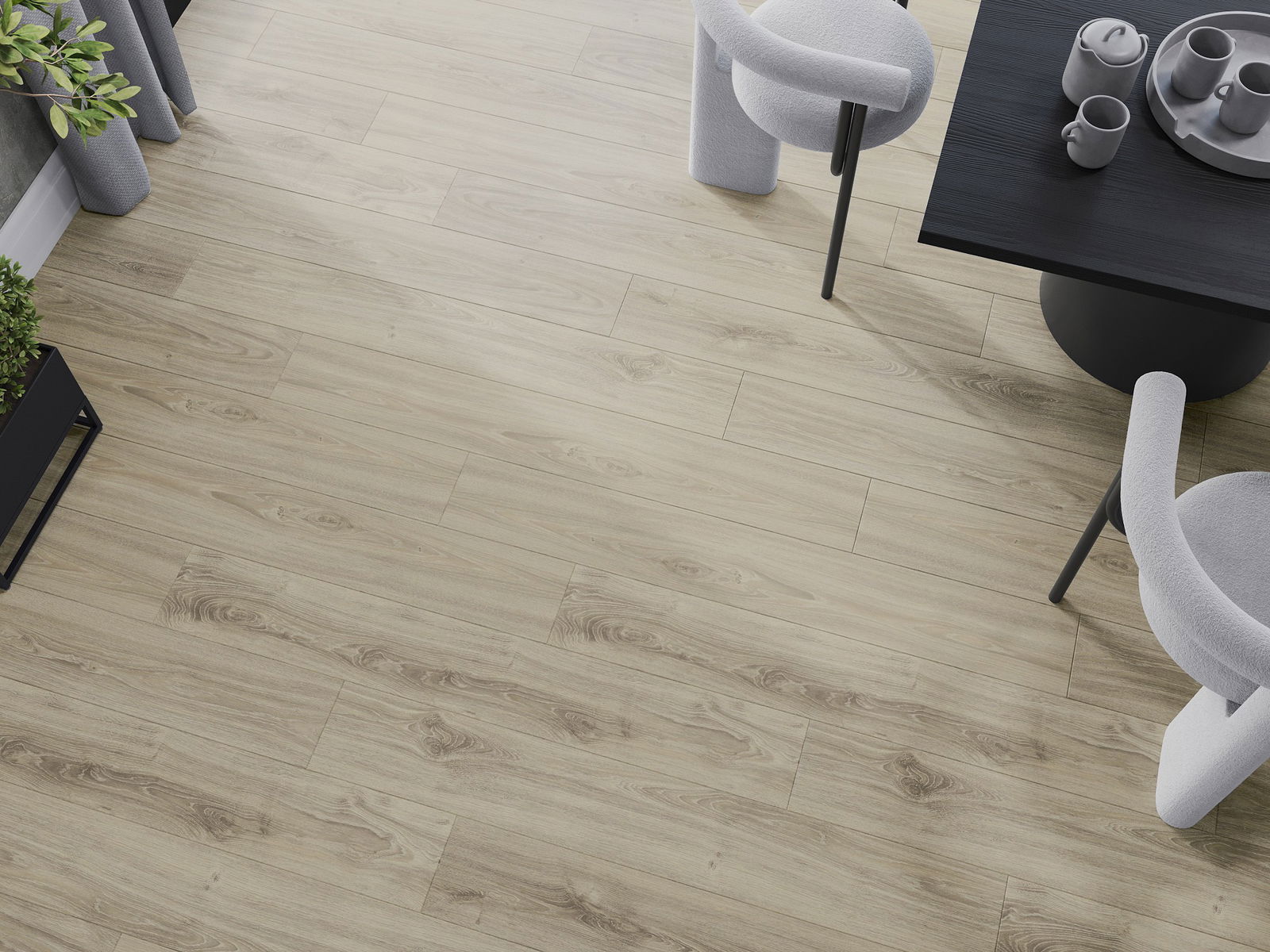 Panelerna har en 4-sidig fog - varje sida har frästs på ett sådant sätt att en V-formad fog skapas när de läggs. Denna design gör att golvet får en tydligare struktur, vilket ger det djup och estetisk karaktär. Denna effekt är särskilt uppskattad i moderna inredningar, där detaljerna betonar interiörens unika utseende.