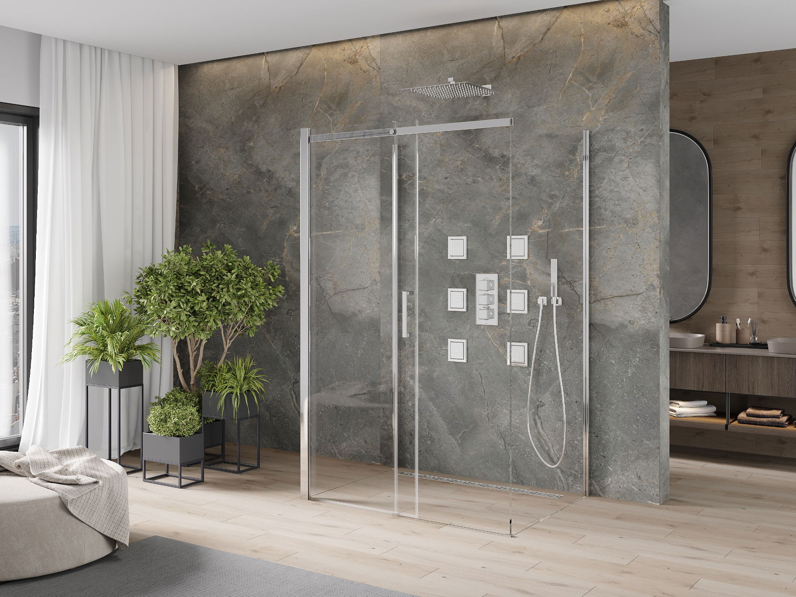 Skjutdörrar rör sig längs specialguider och kräver inget extra utrymme för att öppnas, vilket gör dem lämpliga för mindre badrum. Tack vare de dubbla rullarna med metallhölje är deras rörelse smidig.