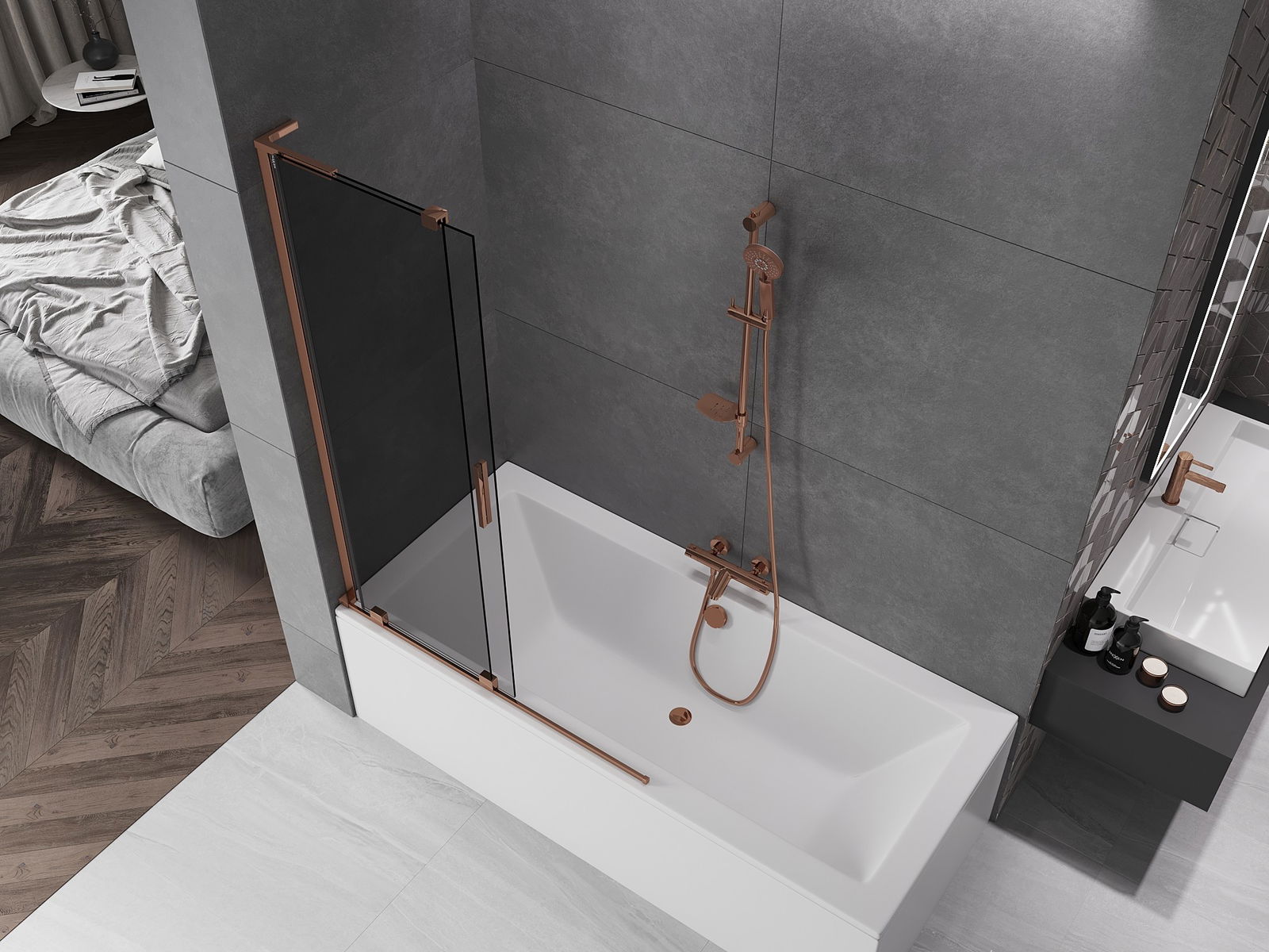 Mexen Velar L 2-delad skjutbar duschvägg 110 x 150 cm, grafit, roséguld - 896-110-003-41-60