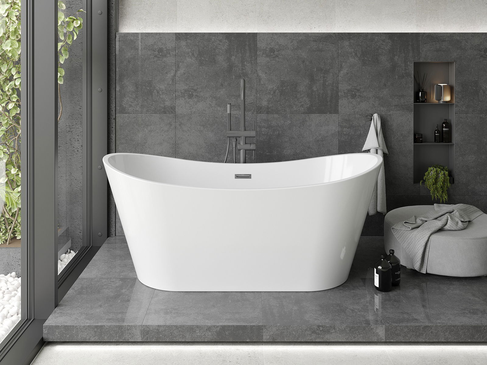 Fristående badkar med måtten 170 x 80 cm, tillverkat i högkvalitativ sanitetakryl, kännetecknas av en elegant vit färg och en innovativ ytbehandling i nyansen gun gray borstad. Med ett djup på 44,5 cm och en höjd på 72 cm erbjuder det bekväm användning. Överflöd och avlopp i mitten lägger till funktionalitet, och motståndet mot mattning och UV-strålning säkerställer hållbarhet i många år. Perfekt för varje modernt badrum, skapar en exklusiv atmosfär.