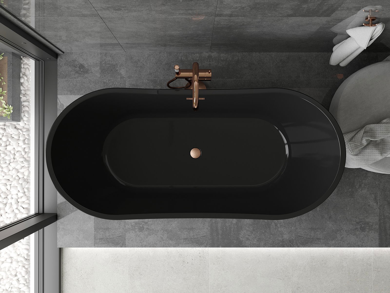 Det svarta fristående badkaret, med måtten 170 x 80 cm, kombinerar elegans med funktionalitet. Tillverkat av sanitär akryl ger det motståndskraft mot mattning och UV-strålning. Den ovala formen samt den höga kvaliteten på finishen i borstad koppar ger det stil. Badkaret har en höjd på 72 cm och ett djup på 44,5 cm, vilket ger komfort under badet. Överfyllnadshål och sifon ingår, vilket gör det till ett perfekt val för varje badrum.