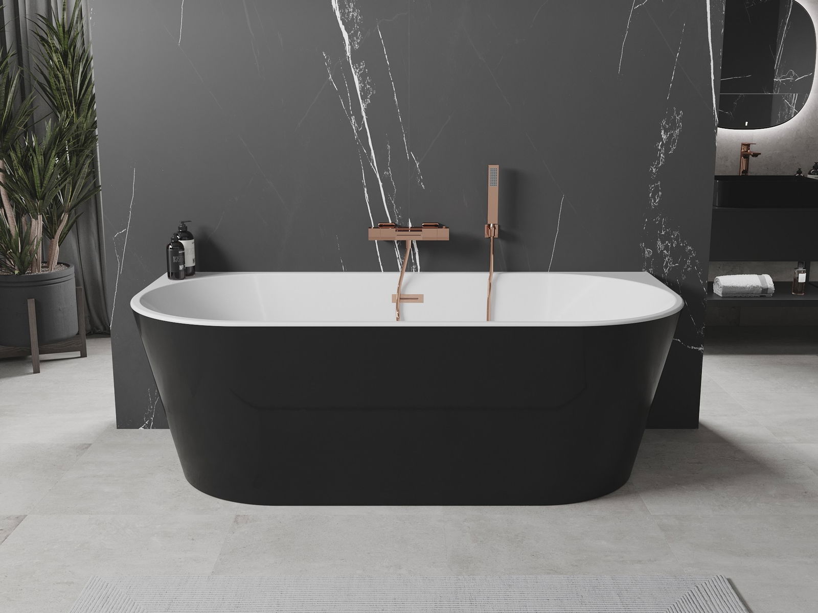 Mexen Oval är ett elegant väggmonterat fristående badkar med måtten 140 x 75 cm, perfekt för moderna badrum. Tillverkat av sanitetsakryl, erbjuder den hög motståndskraft mot mattning och UV-strålning. Den ovala formen samt kombinationen av vit och svart färg ger en stil, medan den borstade kopparfinishen ger en unik visuell effekt. Badkaret är utrustad med överfyllnadshål samt sifon med klick-klack plugg, vilket gör det till ett praktiskt och estetiskt val för ditt utrymme.