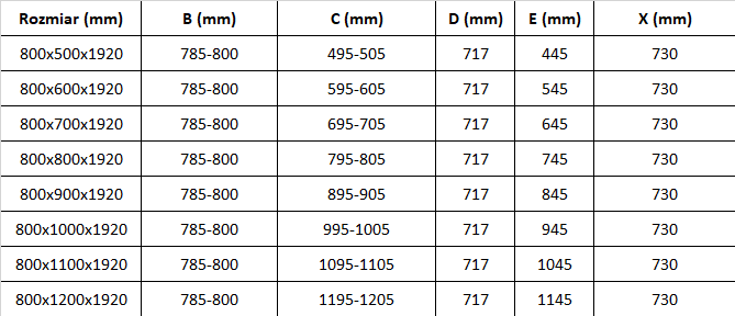 Teknisk data för duschkabin: