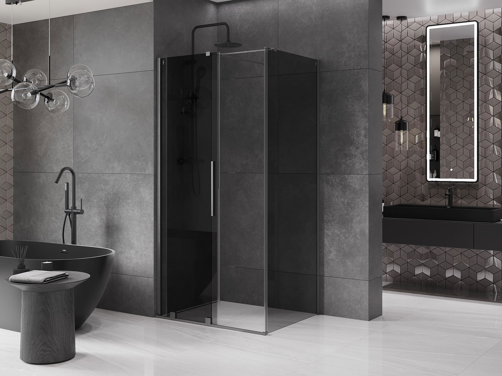 Det praktiska och bekväma handtaget är tillverkat av rostfritt stål. Den moderna formen i kombination med en finish som matchar profilernas färg ger helheten ett modernt och stiligt utseende, vilket framhäver estetiken i varje badrum.