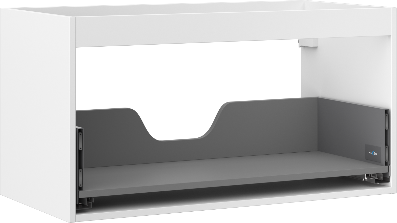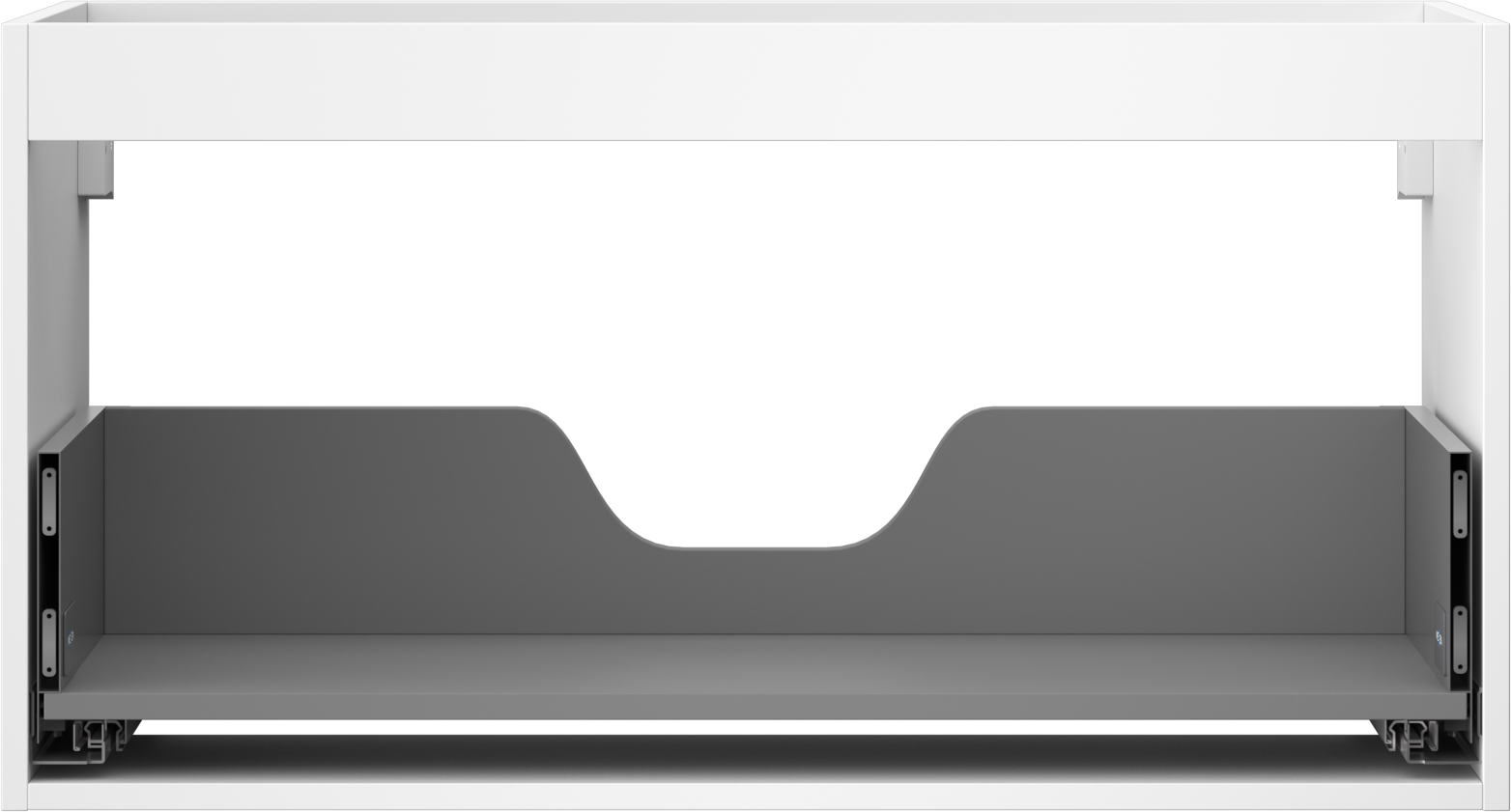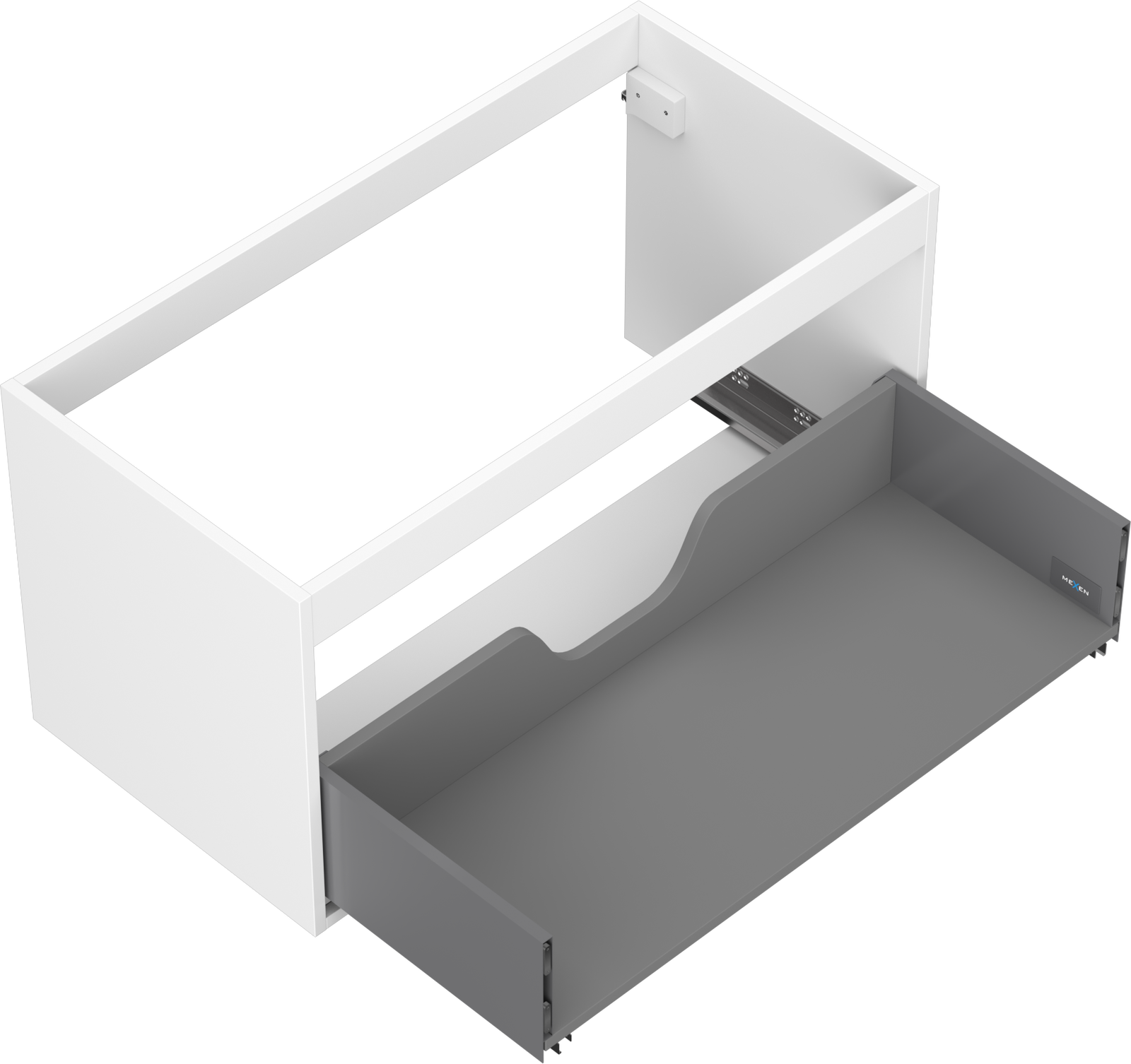 Utskärningen i lådan är utformad på ett sådant sätt att den rymmer vattenlåset som är nödvändigt i tvättställsinstallationer. Tack vare detta kan möbeln installeras fullt ut funktionellt, utan att behöva avstå från utrymme i lådan för installationen.