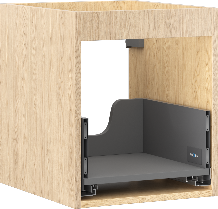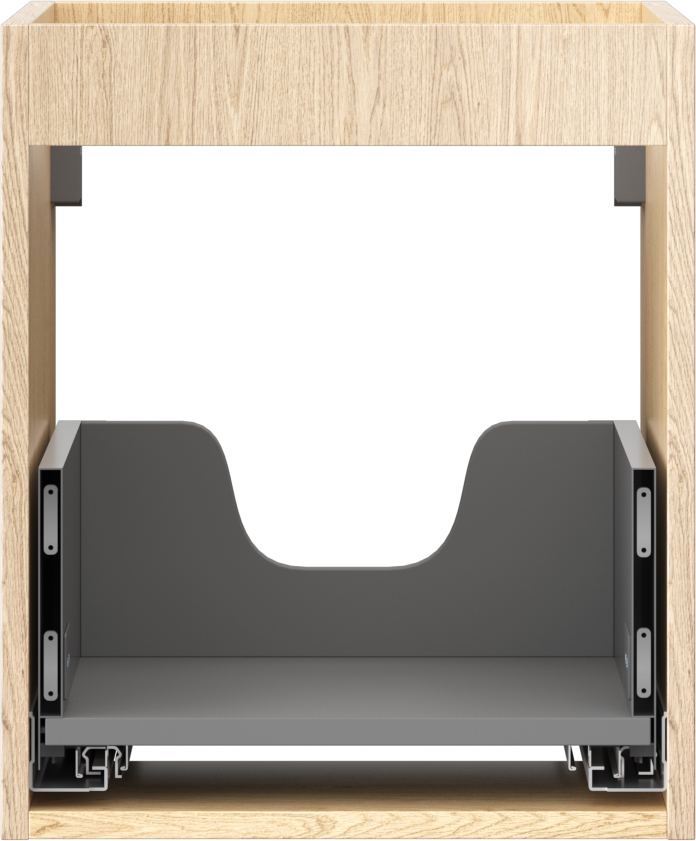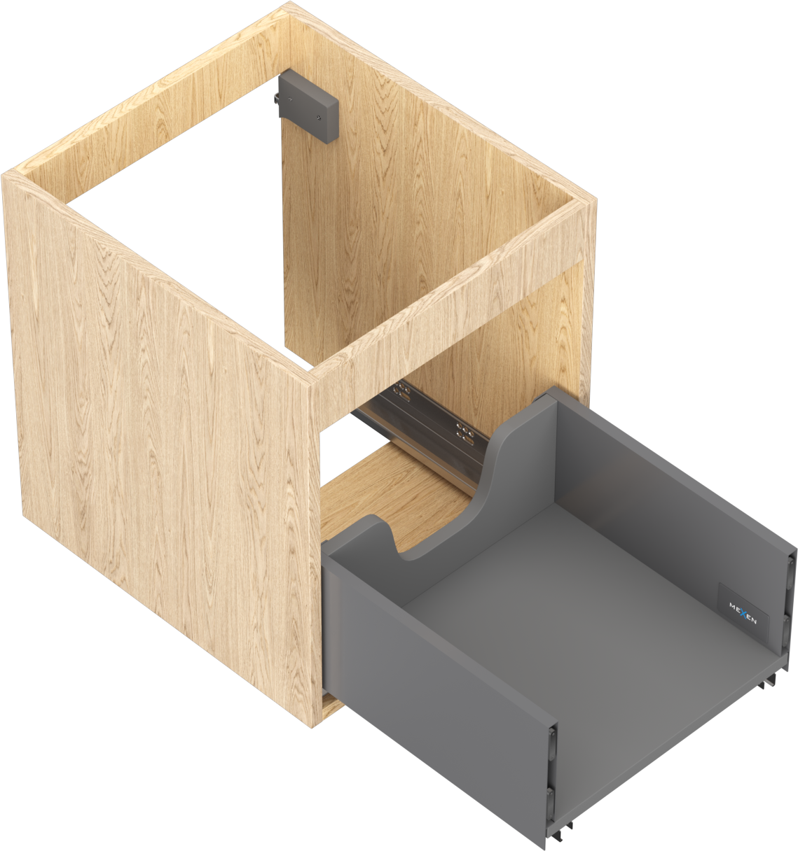 Utskärningen i lådan är utformad på ett sådant sätt att den rymmer vattenlåset som är nödvändigt i tvättställsinstallationer. Tack vare detta kan möbeln installeras fullt ut funktionellt, utan att behöva avstå från utrymme i lådan för installationen.