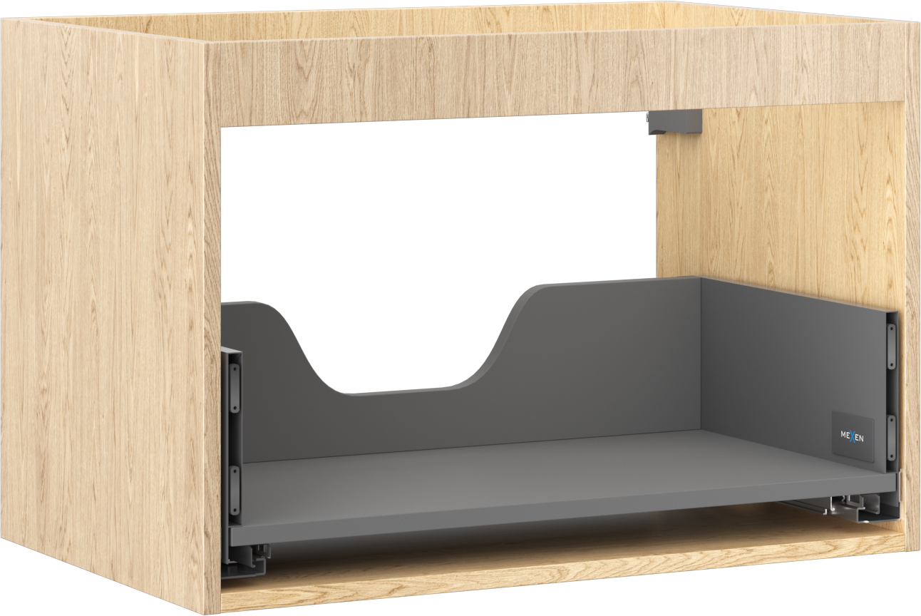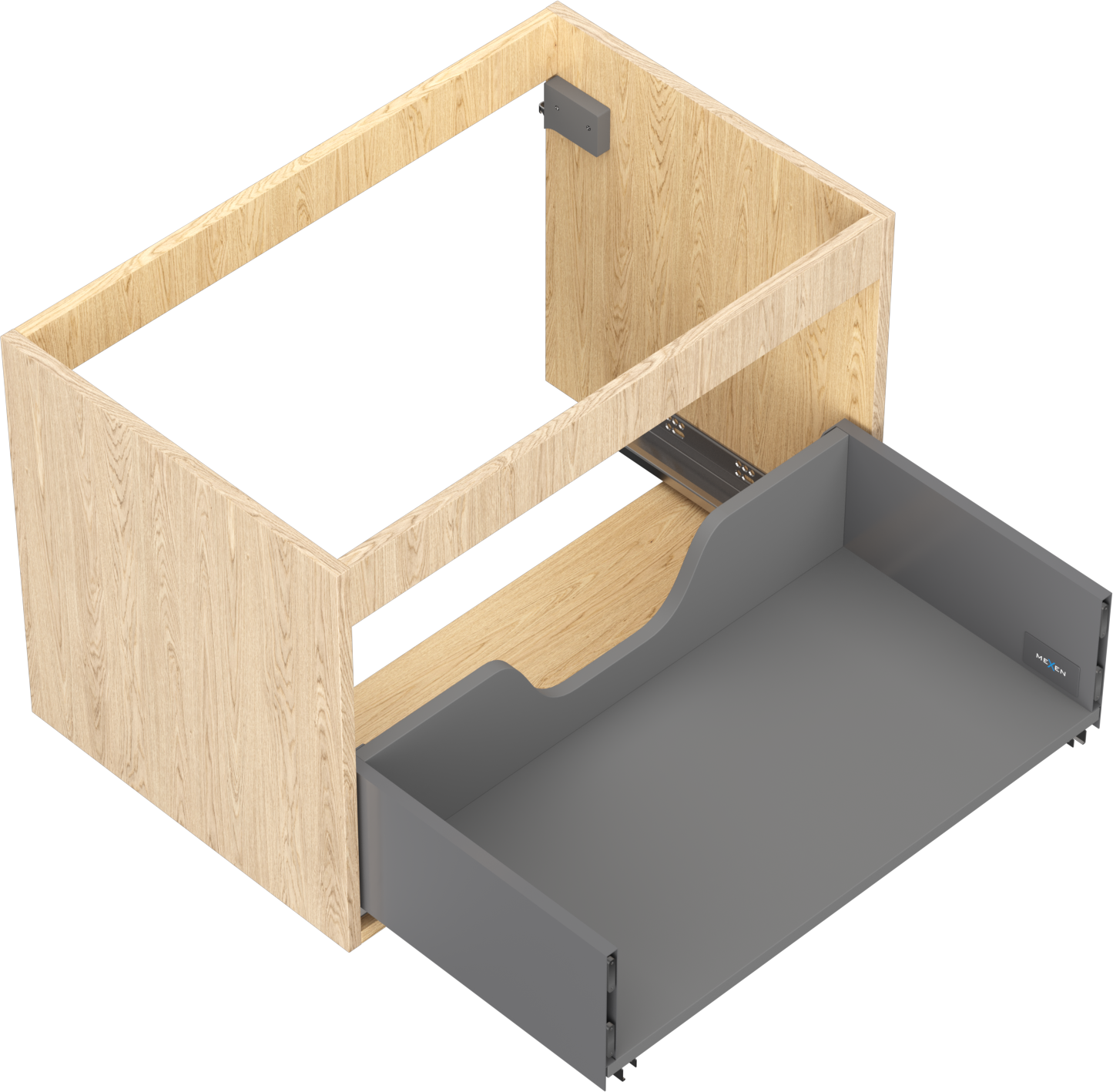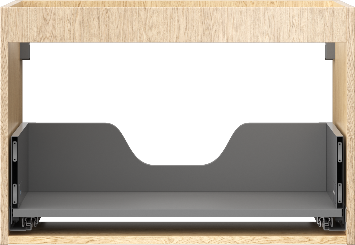 Utskärningen i lådan är utformad på ett sådant sätt att den rymmer vattenlåset som är nödvändigt i tvättställsinstallationer. Tack vare detta kan möbeln installeras fullt ut funktionellt, utan att behöva avstå från utrymme i lådan för installationen.