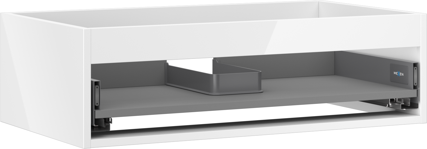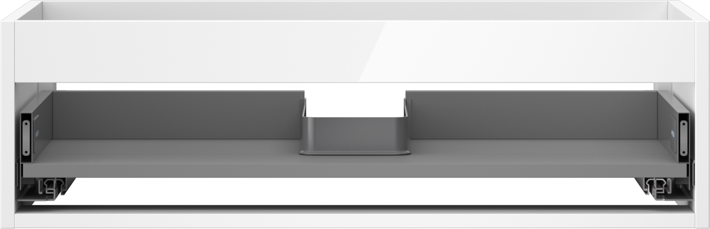 Utskärningen i lådan är utformad på ett sådant sätt att den rymmer vattenlåset som är nödvändigt i tvättställsinstallationer. Tack vare detta kan möbeln installeras fullt ut funktionellt, utan att behöva avstå från utrymme i lådan för installationen.