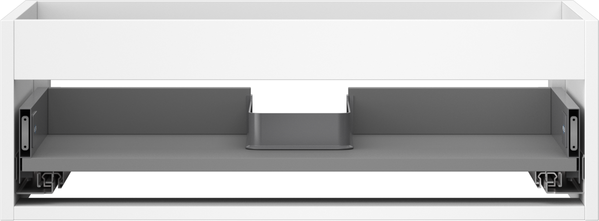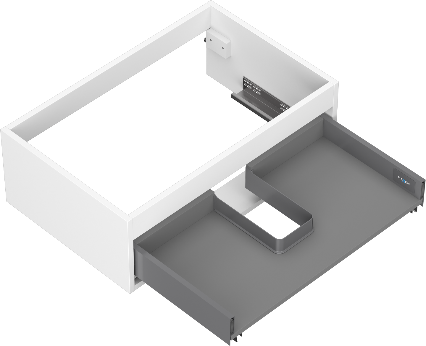 Utskärningen i lådan är utformad på ett sådant sätt att den rymmer vattenlåset som är nödvändigt i tvättställsinstallationer. Tack vare detta kan möbeln installeras fullt ut funktionellt, utan att behöva avstå från utrymme i lådan för installationen.